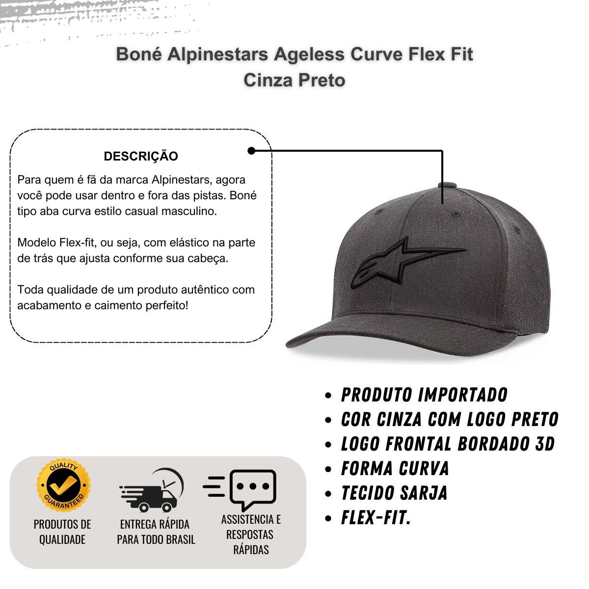 O estilo autêntico da Alpinestars agora também acompanha você fora das pistas. O Boné Ageless Curve Flex Fit traz toda a qualidade de um produto importado, aliado a um design moderno e casual, ideal para o dia a dia ou para completar seu visual streetwear com conforto e personalidade.