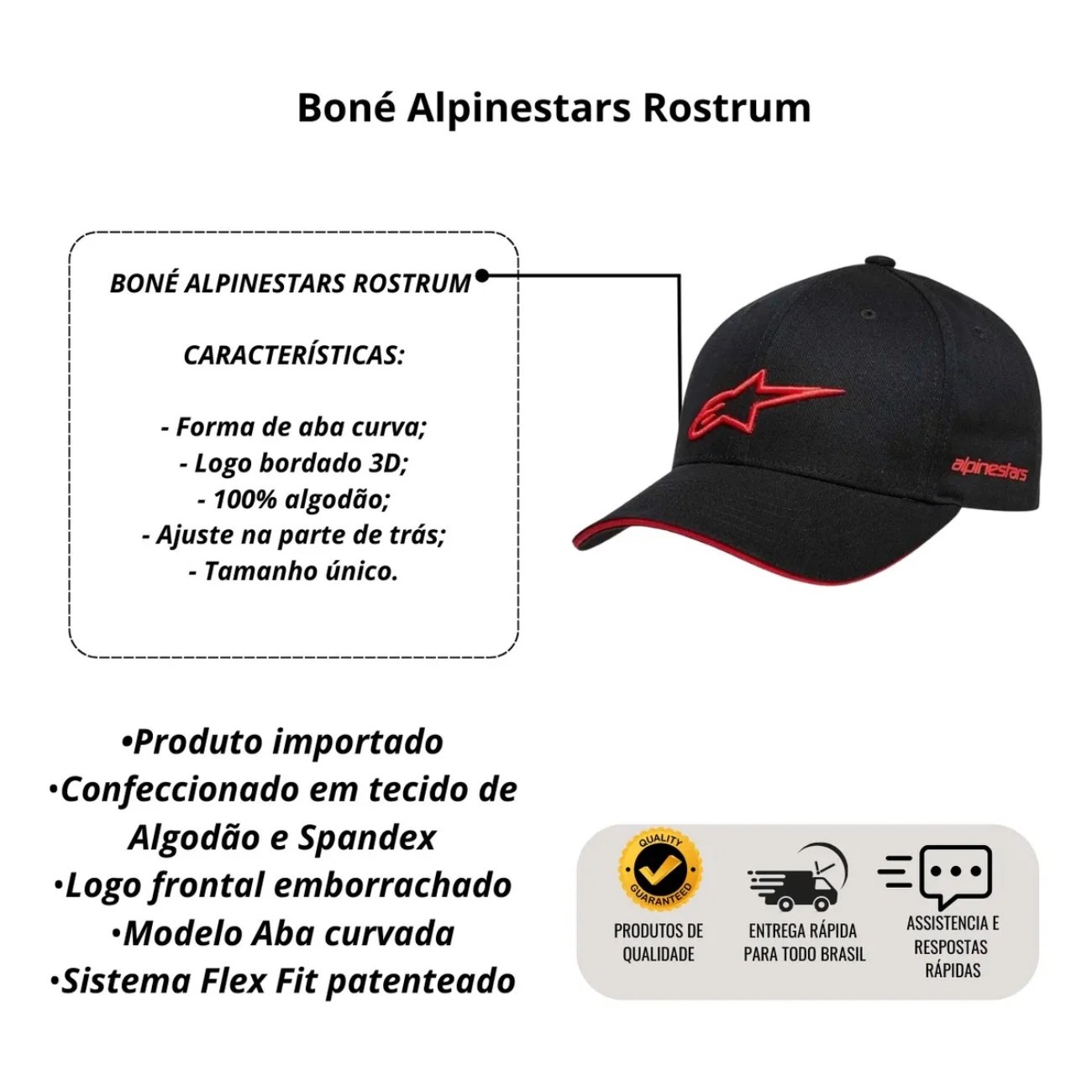 Produzido com 100% algodão, o Rostrum oferece toque macio e excelente respirabilidade, ideal para o uso diário. A aba curva proporciona um visual esportivo e proteção contra o sol, enquanto o logo Alpinestars em bordado 3D destaca a identidade da marca com estilo.