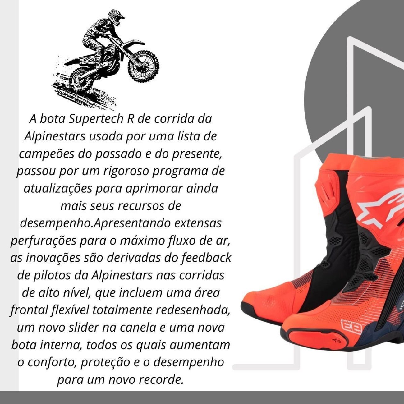 Essa edição é mais que um item técnico — é uma extensão do corpo do piloto, criada para entregar a mesma performance exigida em corridas de nível mundial. Se você busca tecnologia de competição, controle total e proteção certificada, a Supertech R Marquez é a escolha definitiva.