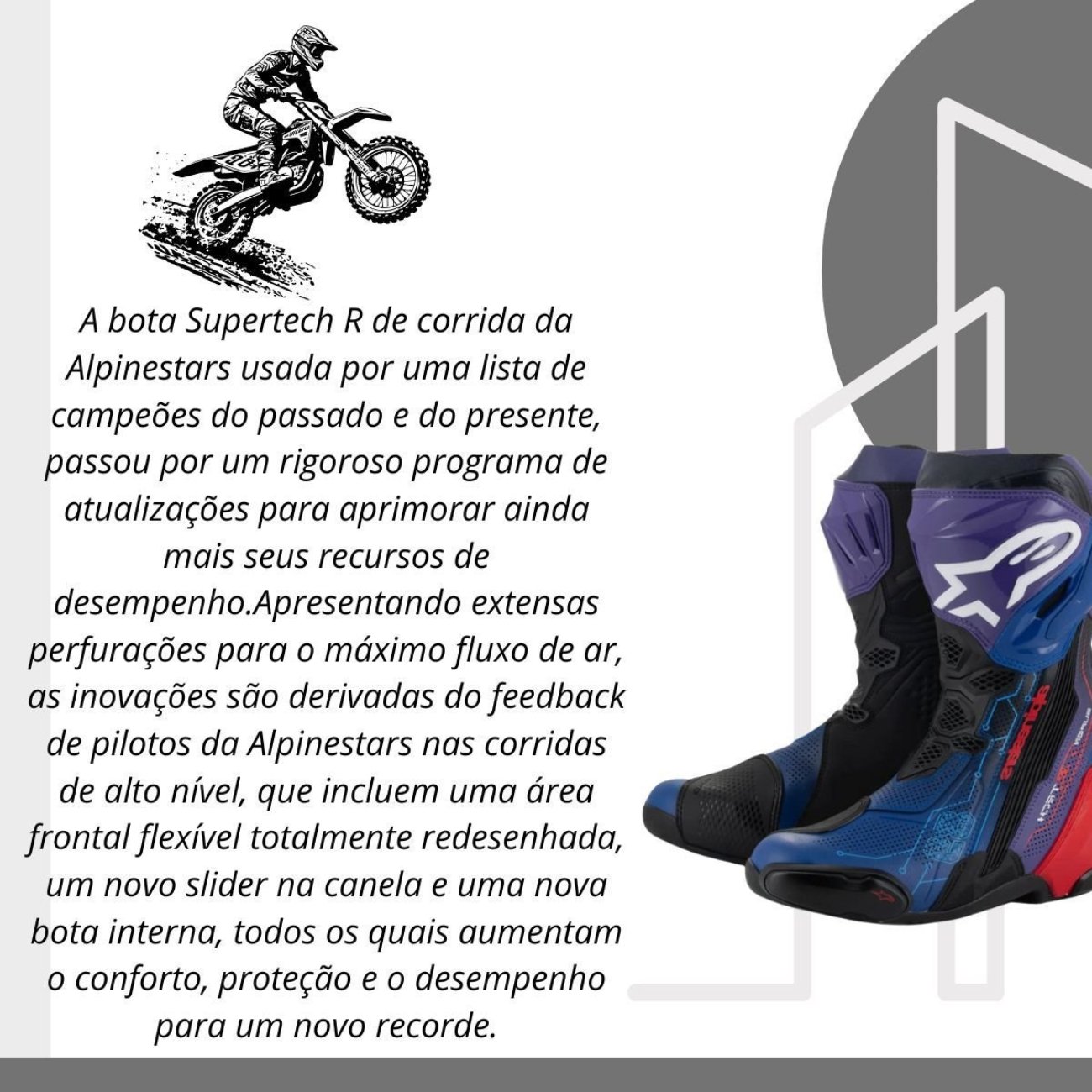 A Bota Alpinestars Supertech R Martinator é a escolha definitiva para pilotos de elite que buscam máxima proteção, conforto e desempenho em pistas e competições. Desenvolvida com as mais avançadas tecnologias do MotoGP, essa bota esportiva une design ergonômico, materiais premium e alta durabilidade para garantir segurança total sem abrir mão da mobilidade.