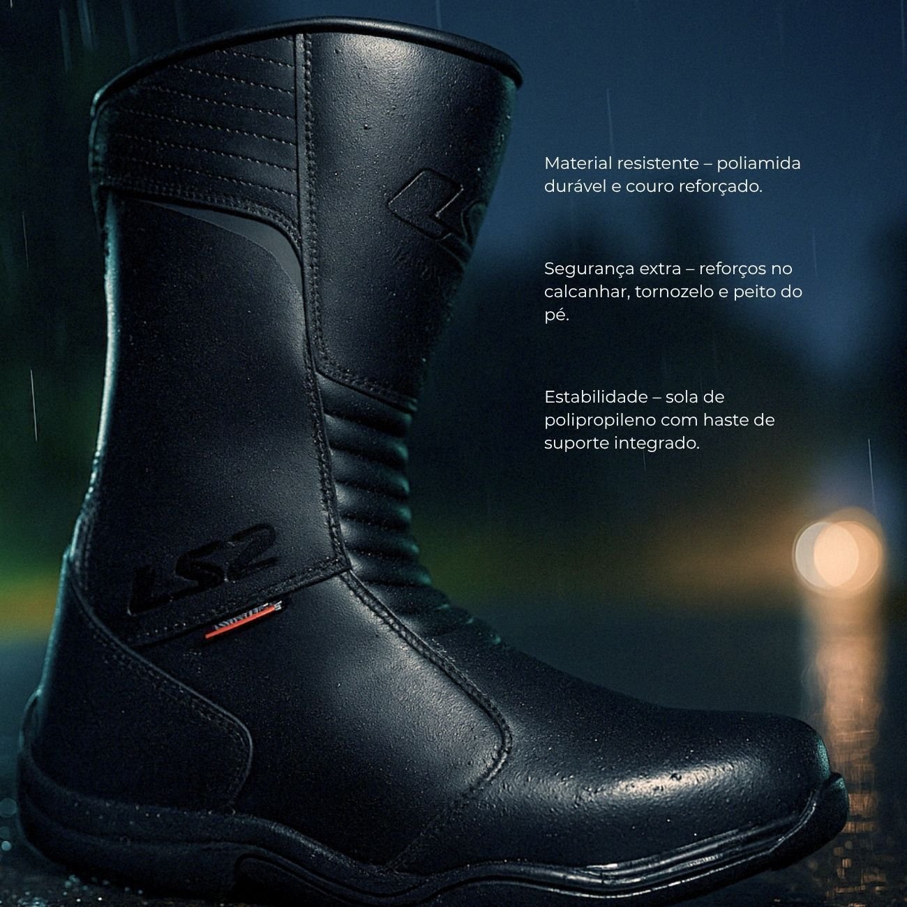 Fabricada com poliamida de alta durabilidade e couro reforçado, essa bota proporciona proteção eficiente nas áreas mais vulneráveis, como calcanhar, tornozelos e peito do pé. As inserções refletivas melhoram sua visibilidade à noite ou sob neblina, contribuindo para uma pilotagem mais segura em qualquer situação.