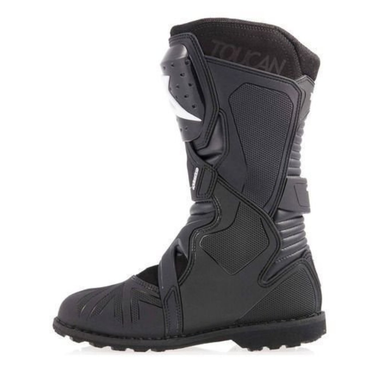 A construção combina couro e suede tratados para alta resistência à abrasão e intempéries, com painéis flexíveis que oferecem conforto e liberdade de movimento. O protetor de canela com sistema de flexão e haste limitadora aumenta o controle e a segurança da articulação. A bota possui ampla abertura com fechamento em Velcro e fechos de alumínio com memória para ajuste rápido e firme. A sola exclusiva de borracha oferece o equilíbrio ideal entre aderência e conforto, complementada pela entressola com haste metálica para distribuir pressão nos pedais, tornando a Toucan uma bota indispensável para viagens longas.