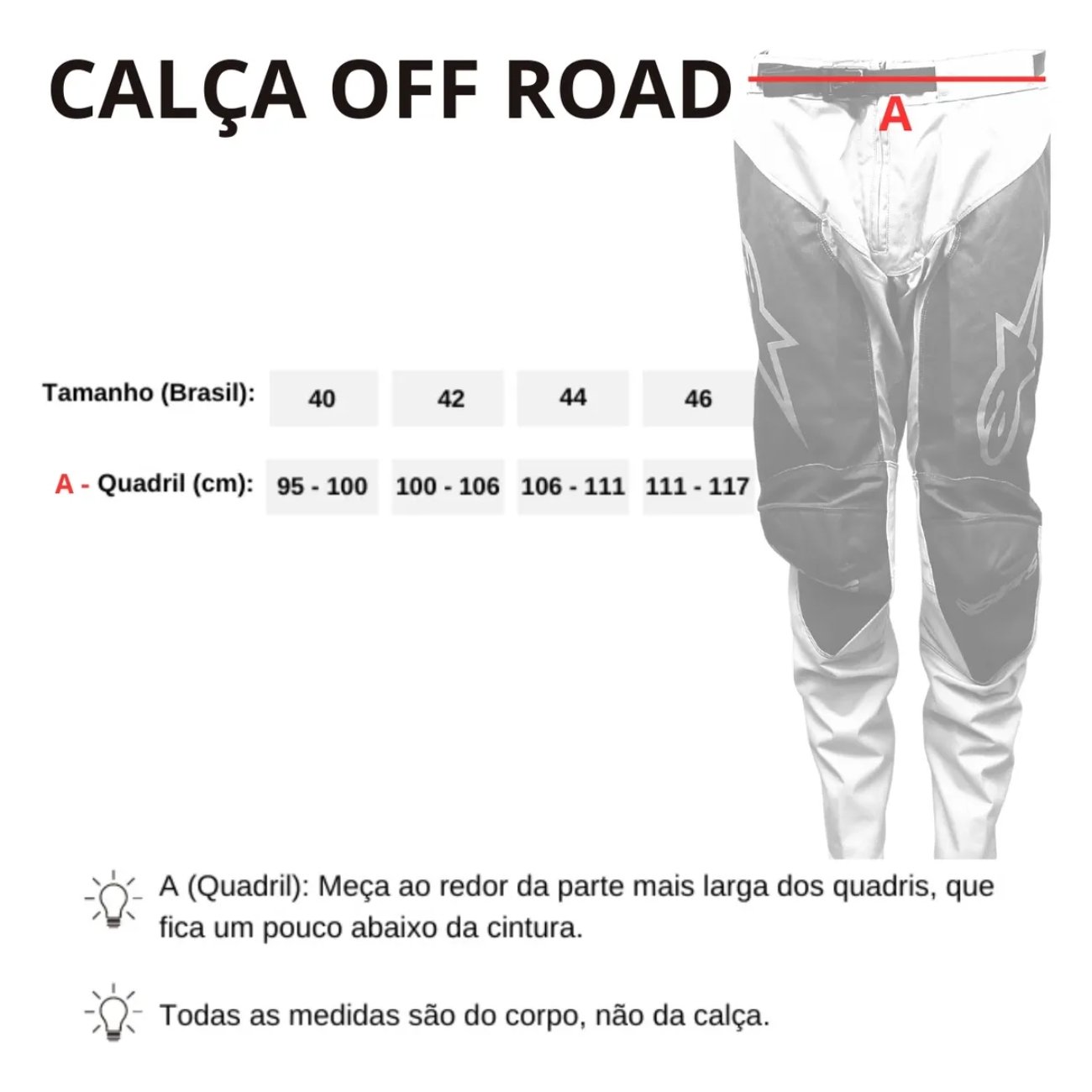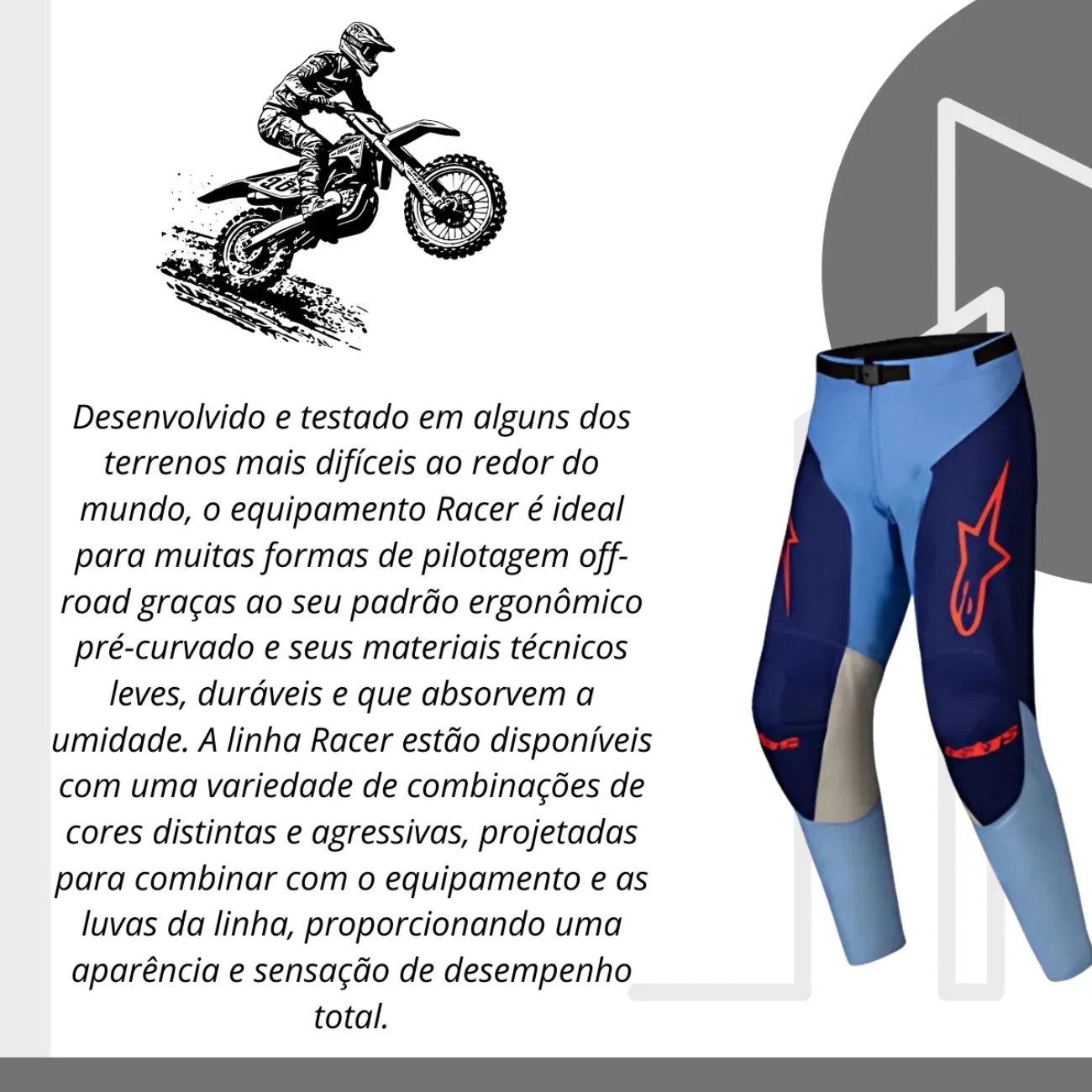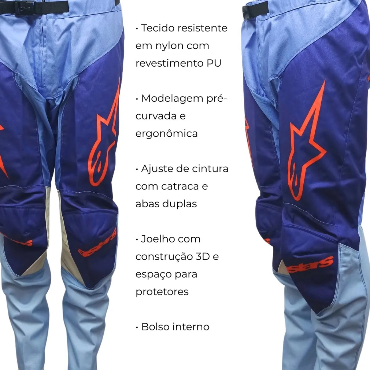 Seu chassi combina poliéster e nylon de alta resistência com reforços em regiões estratégicas, como joelhos e quadris, além de contar com painéis elásticos e zonas de ventilação que favorecem a flexibilidade e o fluxo de ar. A construção leve evita restrições nos movimentos e o sistema de ajuste na cintura com velcro garante encaixe firme durante toda a pilotagem.