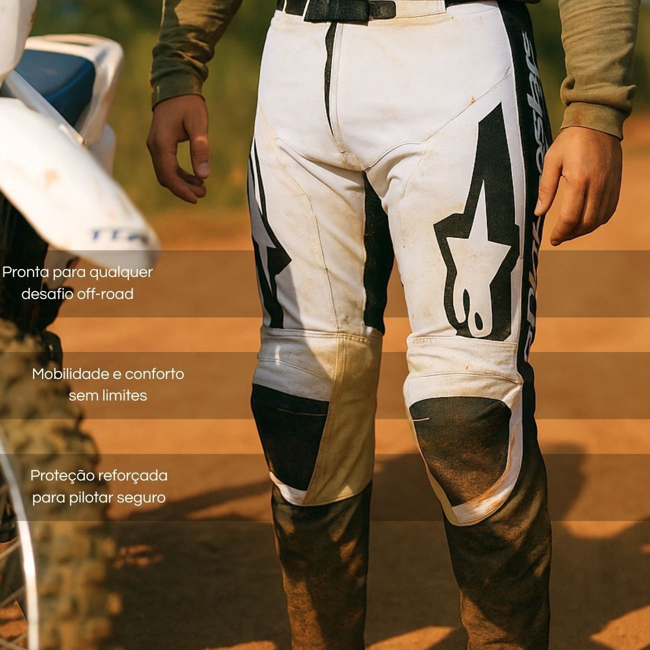 O design pré-curvado proporciona encaixe natural na posição de pilotagem, enquanto o tecido polifabric 600D com reforços estratégicos nas áreas de maior desgaste garante proteção contra abrasão sem comprometer a leveza. Inserções em ripstop elástico, derivadas da linha Supertech, aumentam a flexibilidade nos movimentos, mesmo em manobras intensas.