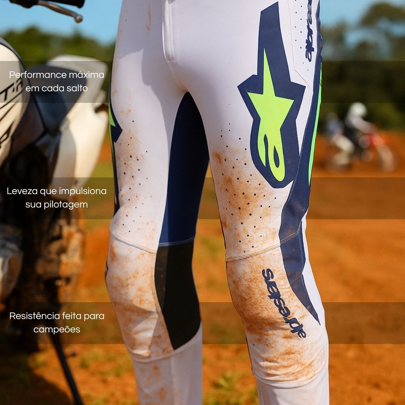 Ajuste Pro Rider: corte atlético premium com modelagem ergonômica, proporcionando flexibilidade, conforto e liberdade de movimento ideais para pilotos profissionais.