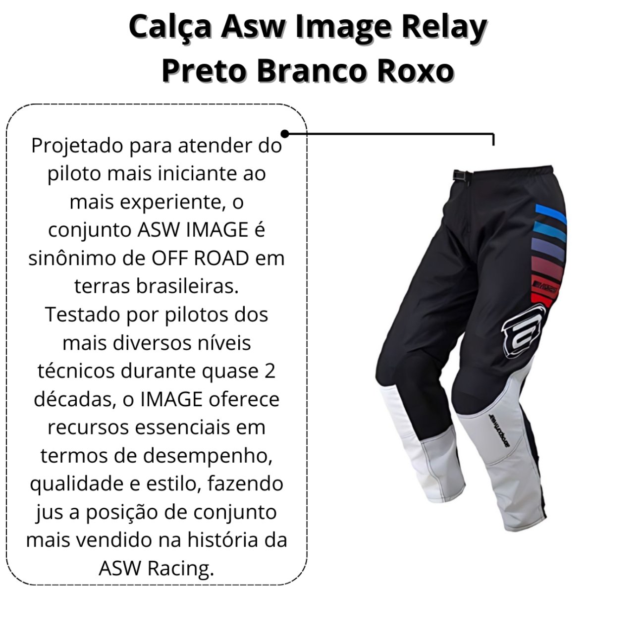 A Calça ASW Image Relay foi criada para pilotos que buscam o equilíbrio ideal entre estilo, proteção e performance. Com seu visual arrojado nas cores preto, branco e roxo, é perfeita para quem encara trilhas e pistas com atitude e confiança.