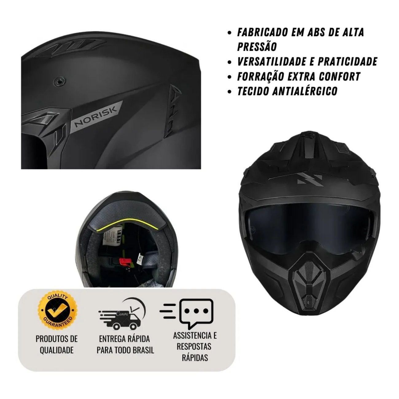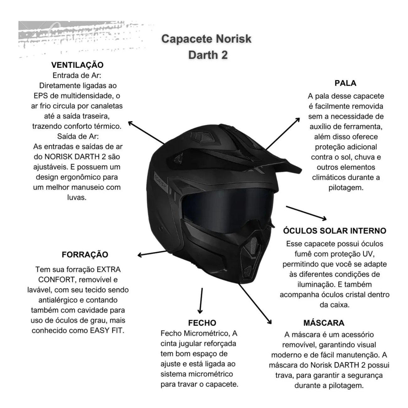 O NORISK DARTH 2 chega para revolucionar a experiência do motociclista que busca um capacete multifuncional, seguro e com design moderno. Com estrutura em ABS de alta pressão, o capacete alia leveza e alta resistência, garantindo proteção superior sem abrir mão do conforto. Seu conceito 4 em 1, com pala e máscara removíveis, oferece máxima versatilidade para se adaptar a diferentes estilos, climas e necessidades.