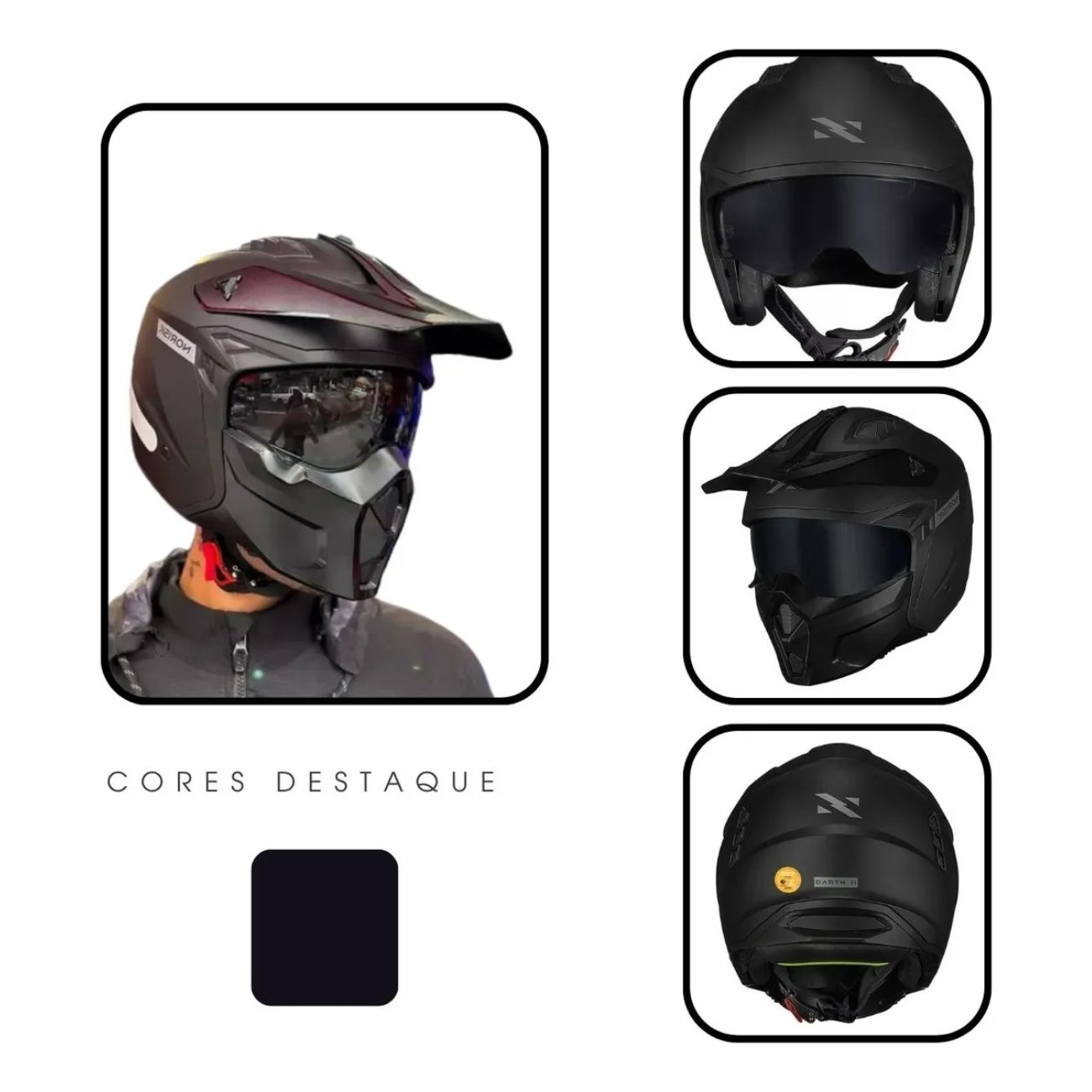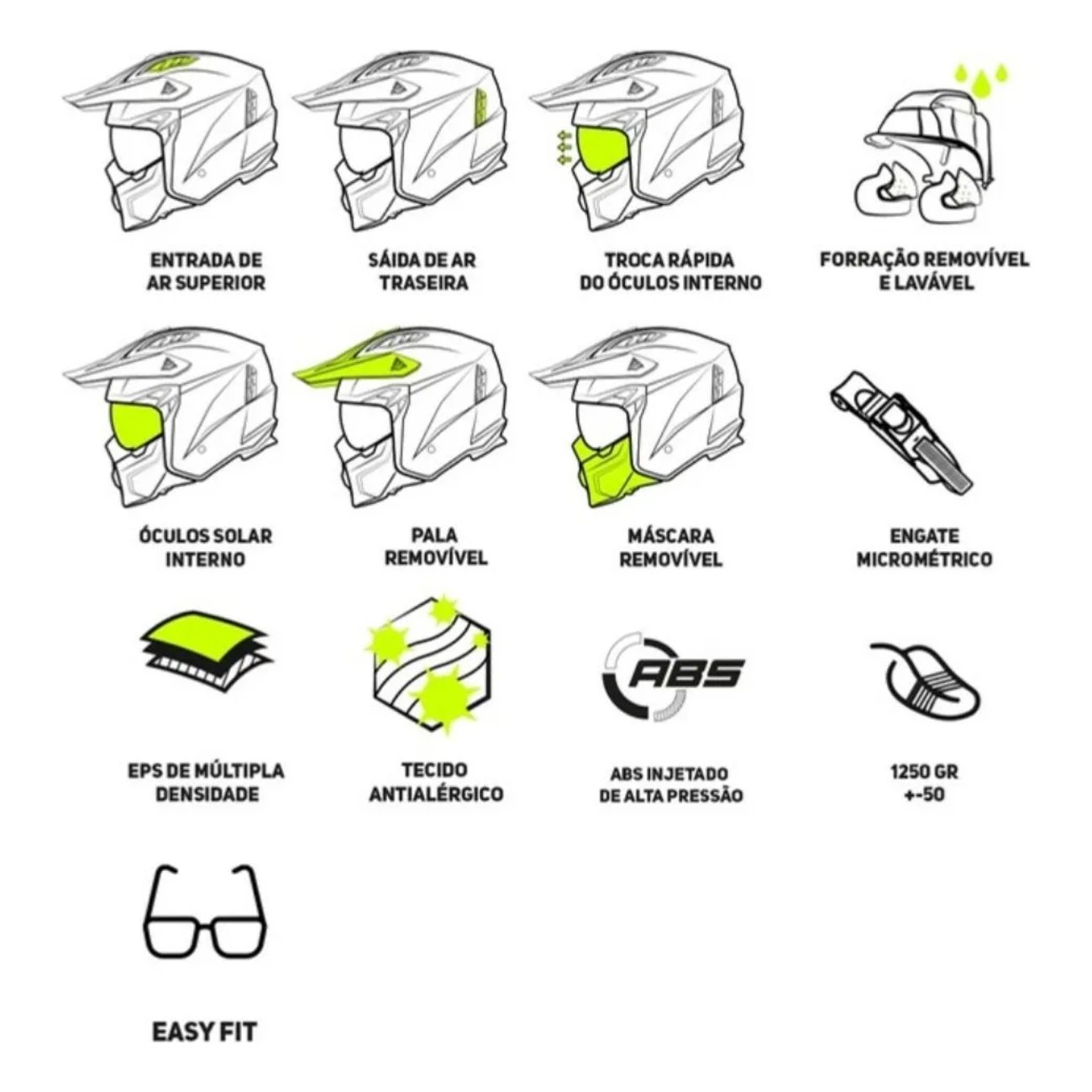 Equipado com óculos solar interno fumê com proteção UV e óculos cristal incluso, o DARTH 2 proporciona praticidade e segurança visual em qualquer situação. A máscara removível com trava reforça a proteção e o estilo agressivo, enquanto a pala aerodinâmica pode ser removida sem ferramentas, ampliando as possibilidades de uso.