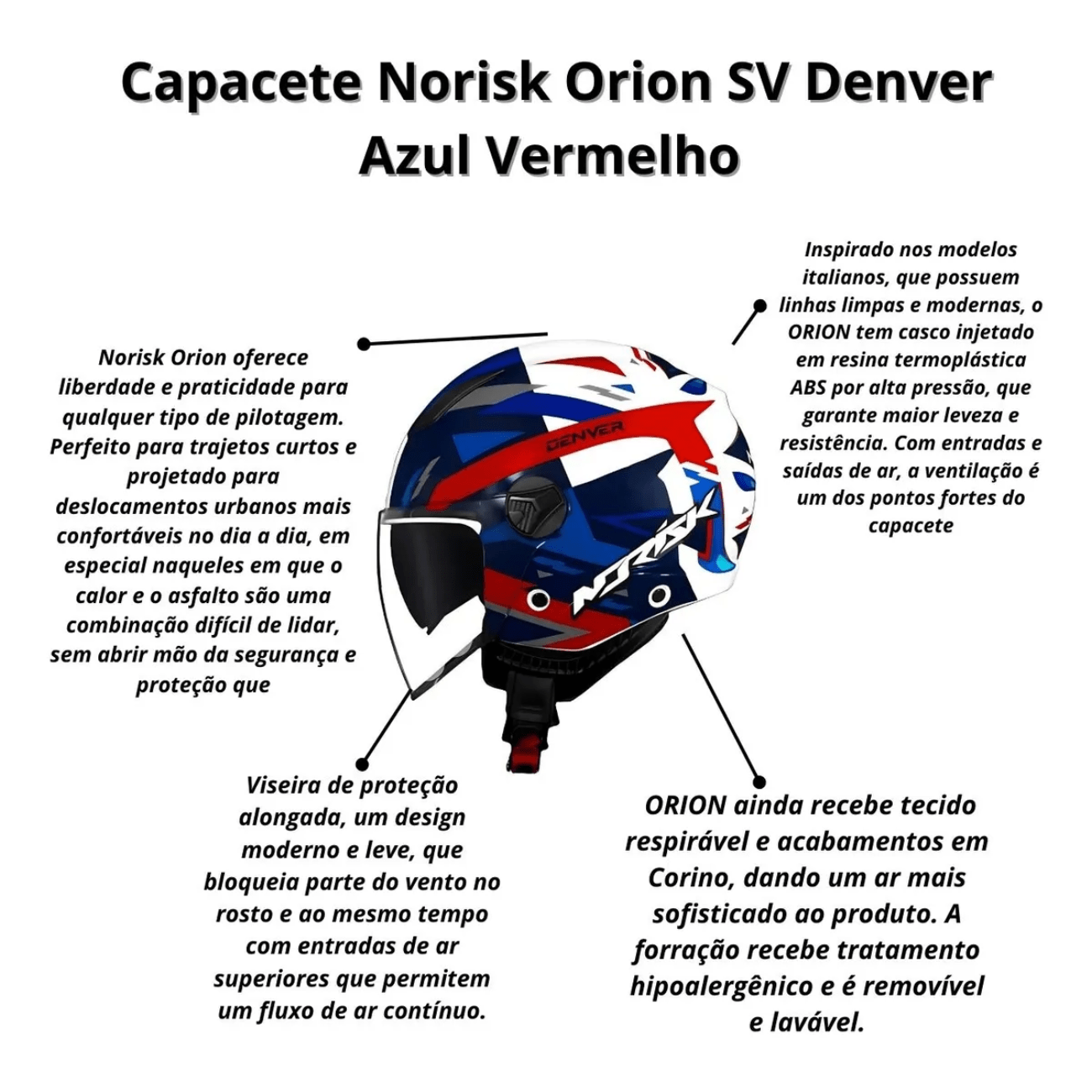 O Capacete Norisk Orion SV é a combinação ideal entre estilo moderno, praticidade e segurança para o uso diário. Seu design aerodinâmico com linhas contemporâneas oferece um visual arrojado que agrada diversos perfis de motociclistas, enquanto o óculos solar interno proporciona conforto e proteção adicional contra a luz solar.