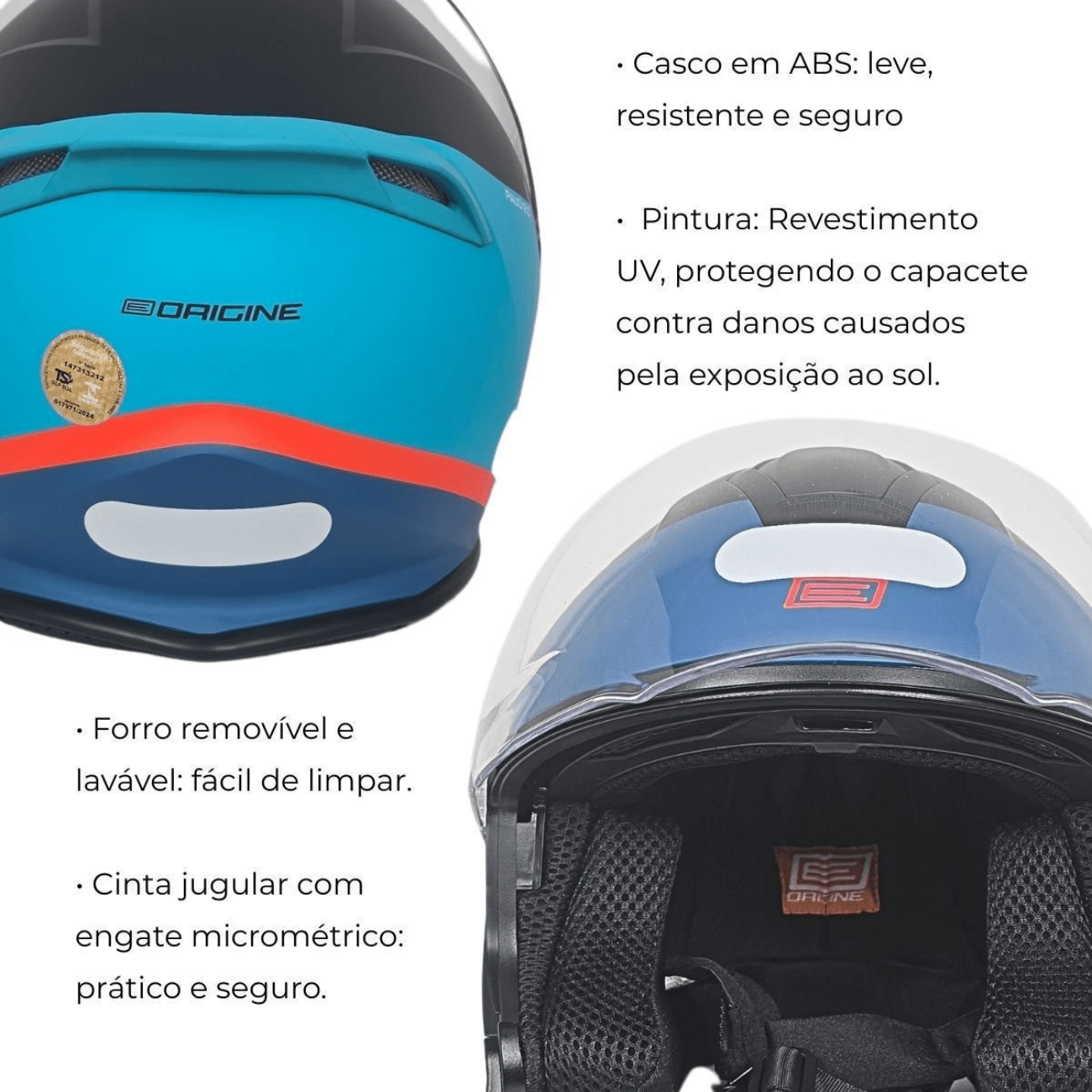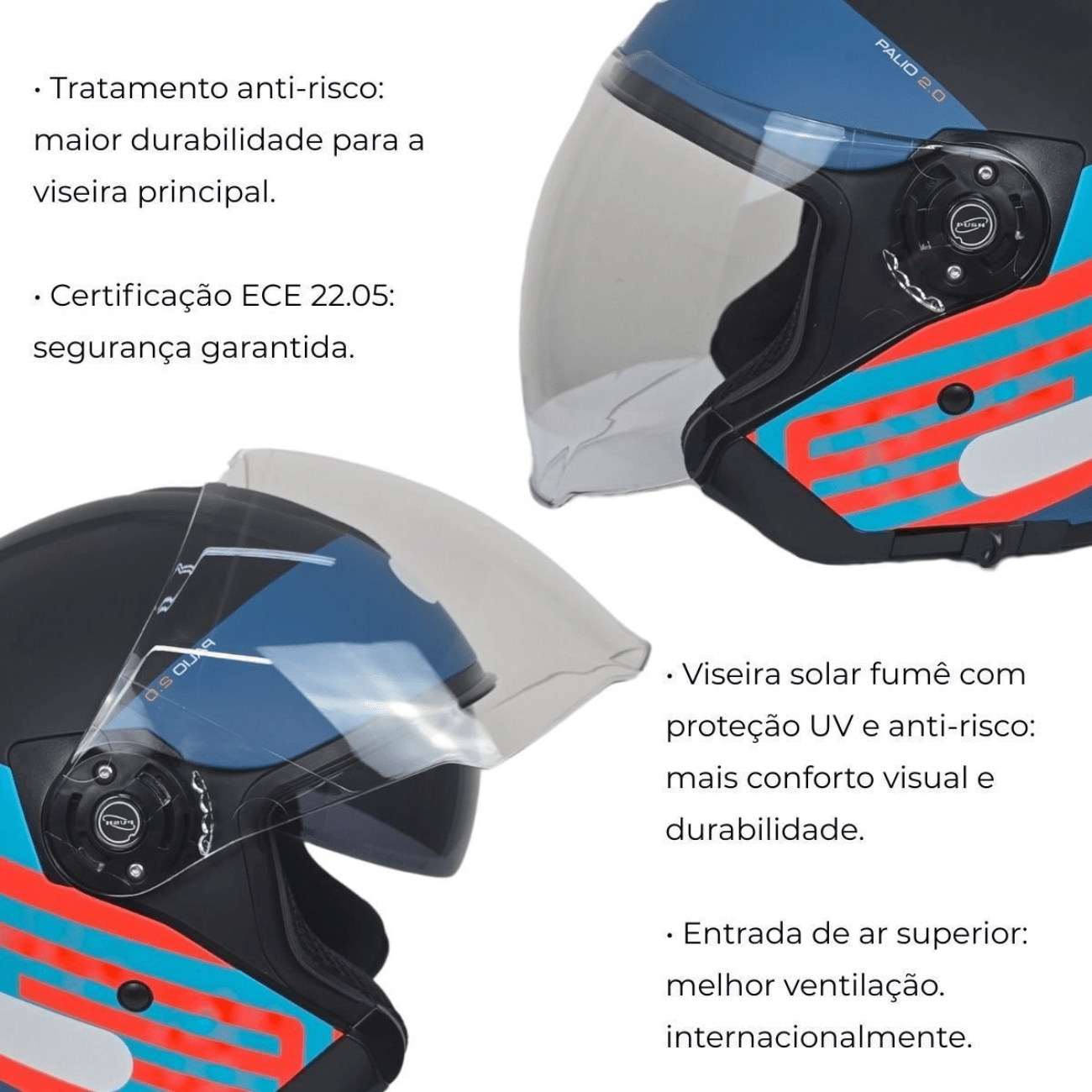 Seu casco em resina termoplástica ABS garante resistência com peso reduzido, tornando a pilotagem mais leve e confortável. A viseira cristal com tratamento anti-risco oferece ampla visão, enquanto a viseira solar interna fumê com proteção UV proporciona conforto visual nos dias ensolarados.