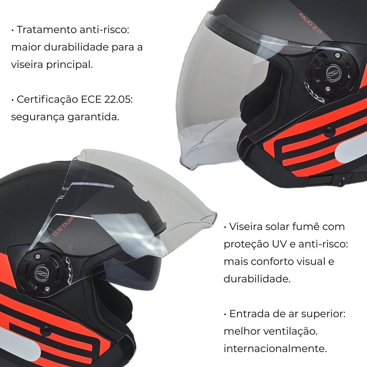 Seu casco em resina termoplástica ABS oferece resistência com peso reduzido, tornando o uso mais confortável mesmo em longos períodos. A viseira cristal com tratamento anti-risco garante visão clara e durável, enquanto a viseira solar interna fumê com proteção UV proporciona conforto visual em dias ensolarados.