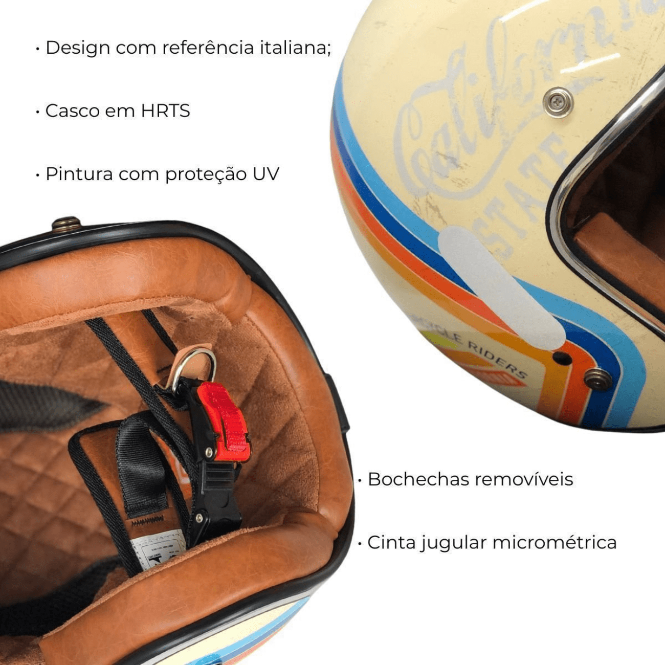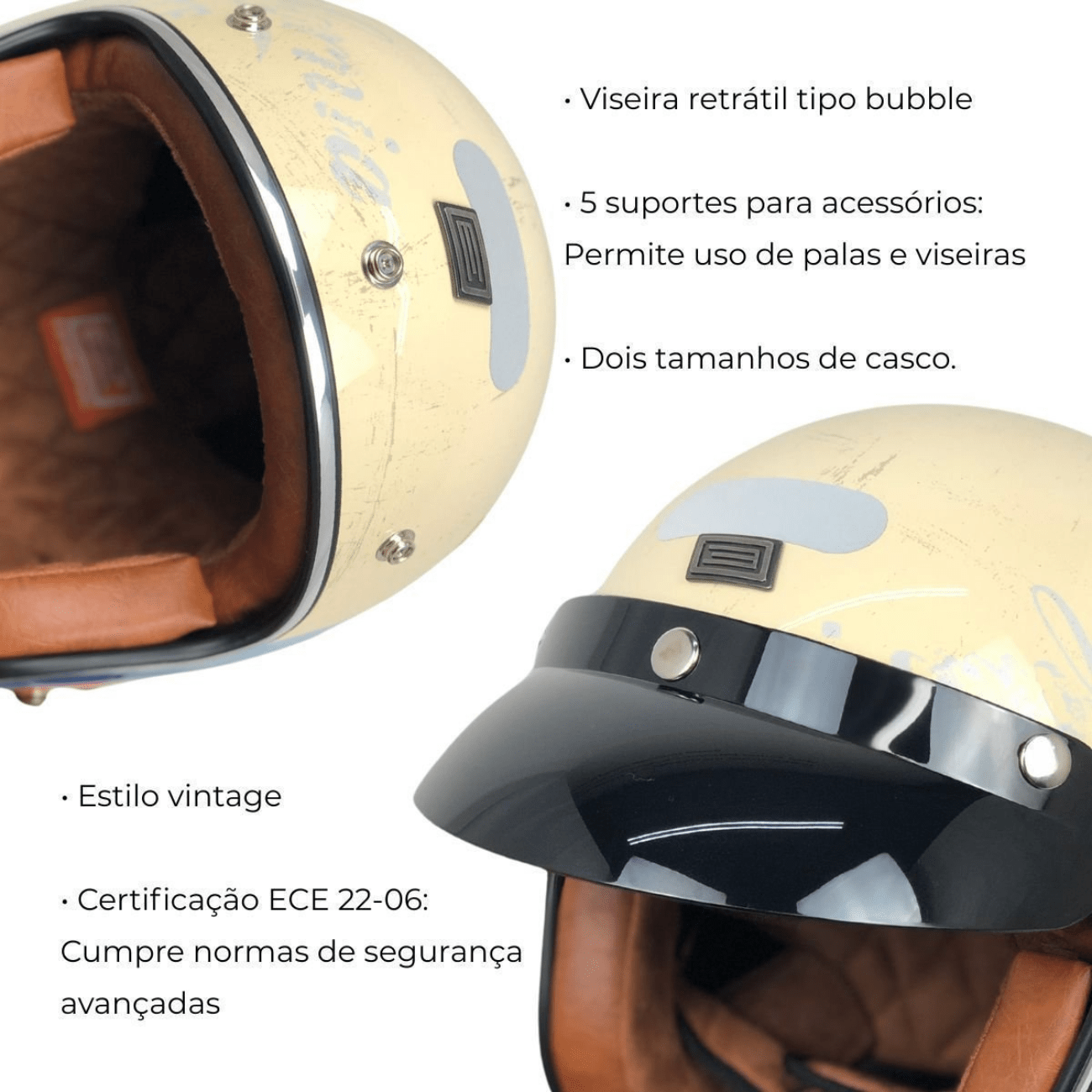 O Capacete Origine Primo é a escolha ideal para motociclistas que buscam um modelo retrô, leve e confortável. Com design compacto e grafismos vintage exclusivos, alia estilo clássico à praticidade do dia a dia. Seu interior ergonômico garante encaixe perfeito, enquanto os suportes para acessórios permitem personalização com palas e viseiras bubble, incluindo suporte para óculos aviador, inspirado no universo café racer.