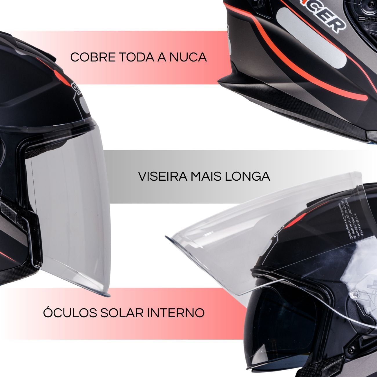 A viseira de 2,2 mm de espessura, com 3 estágios de abertura, limitador de curso, proteção anti-risco e cobertura que ultrapassa o queixo, garante ampla visibilidade e maior proteção contra vento, detritos e impactos leves. O óculos solar interno retrátil proporciona comodidade em dias ensolarados, sem distorcer a visão.