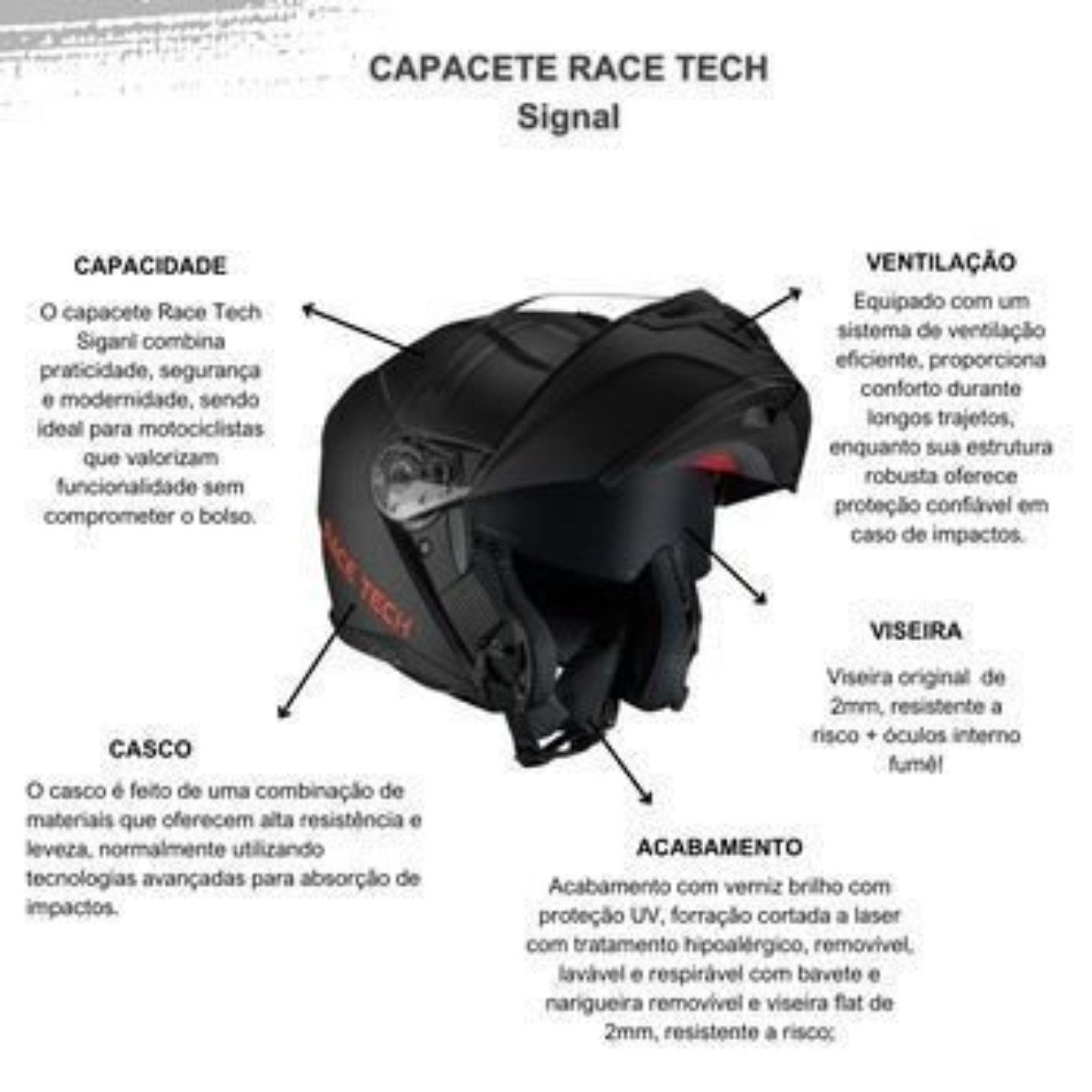 Reconhecida pela excelência em vestuário para motociclistas, a Race Tech apresenta o Capacete Signal, um modelo que alia segurança, conforto e praticidade com um dos melhores custos-benefícios do mercado. Pensado para o dia a dia, o Signal é ideal para quem busca mobilidade com proteção confiável e design moderno.