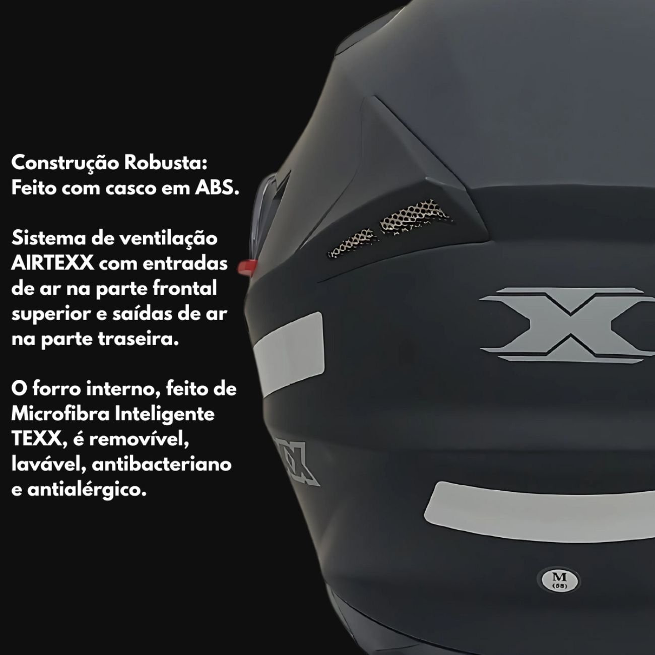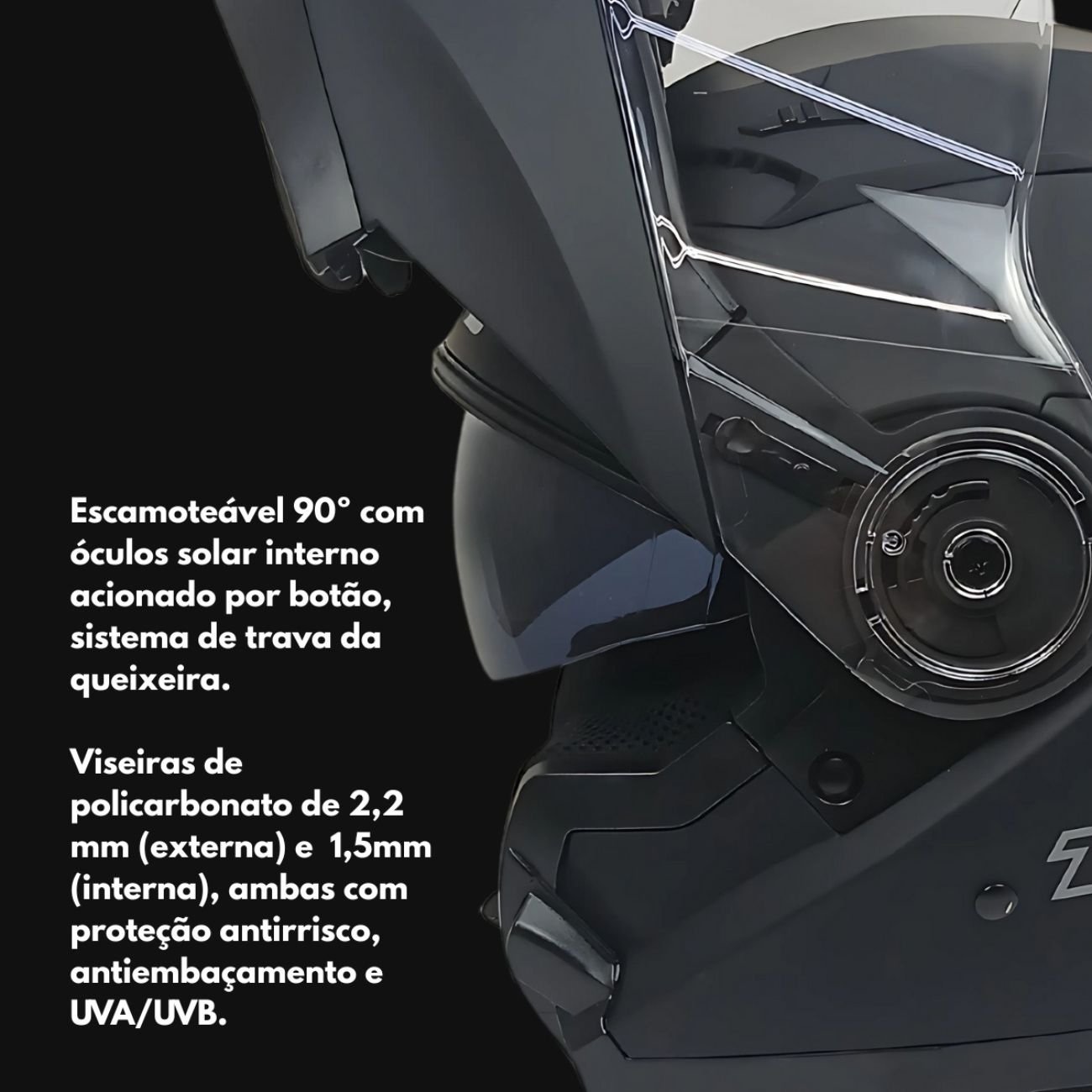 Conta com frente escamoteável, viseiras com tratamento antirrisco e antiembaçante, além de proteção UVA/UVB. O conforto interno é garantido por um forro em microfibra inteligente com ação antifúngica e antibacteriana.