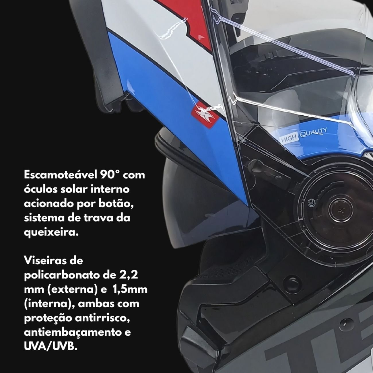 Entre os destaques estão o sistema de ventilação com entradas e saídas de ar, o encaixe preciso das viseiras, a aerodinâmica do casco e o acionamento da viseira solar por botão lateral. O modelo também se destaca por ser um dos mais leves da categoria, com peso aproximado de 1600 gramas.