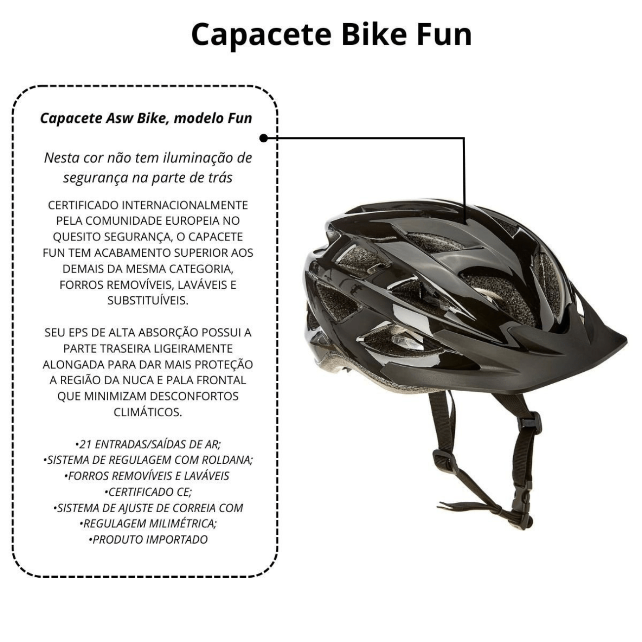 O Capacete ASW Bike Fun foi desenvolvido para ciclistas que buscam segurança, conforto e visibilidade durante pedaladas diurnas ou noturnas. Certificado internacionalmente pela comunidade europeia (CE), oferece proteção de alto padrão com EPS de alta absorção e design ergonômico que inclui proteção extra para a nuca e pala frontal que minimiza desconfortos climáticos. A iluminação traseira em LED garante maior visibilidade e segurança no trânsito ou em pedaladas noturnas.