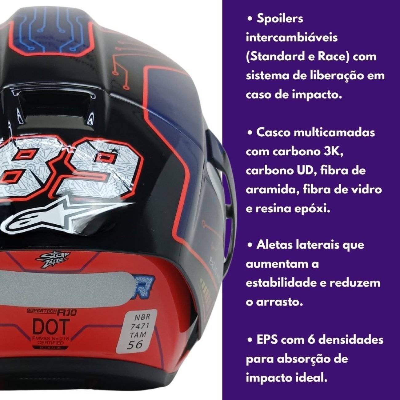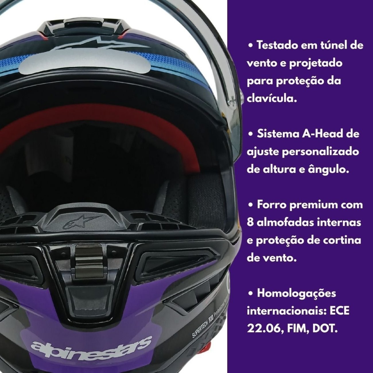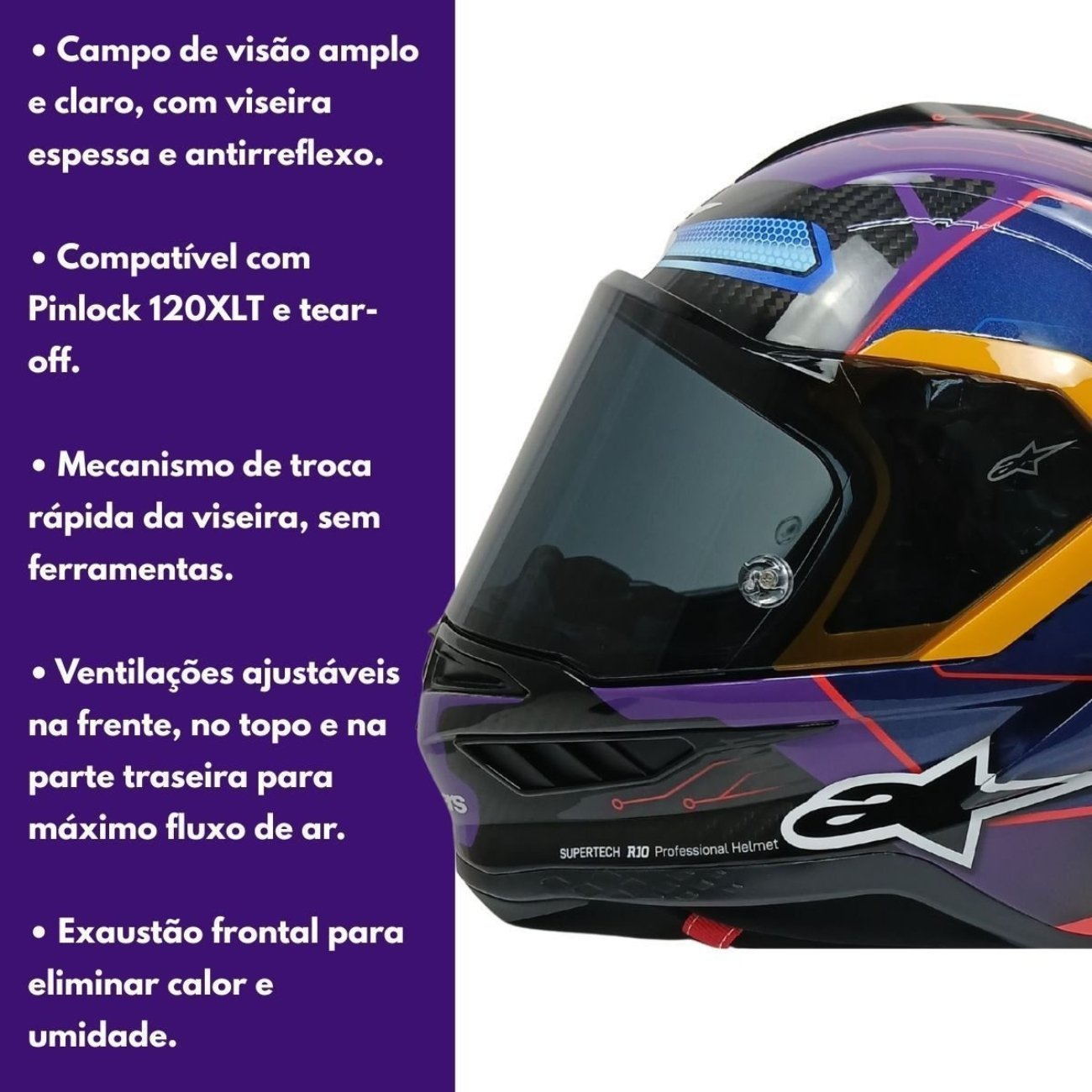 O Capacete Alpinestars Supertech R10 é o resultado de quase uma década de pesquisa, desenvolvimento e testes com pilotos profissionais de MotoGP, elevando o conceito de segurança e performance para um novo patamar. Construído com materiais de alta tecnologia e design aerodinâmico avançado, ele oferece proteção máxima, conforto excepcional e ajuste personalizado para pilotos exigentes.