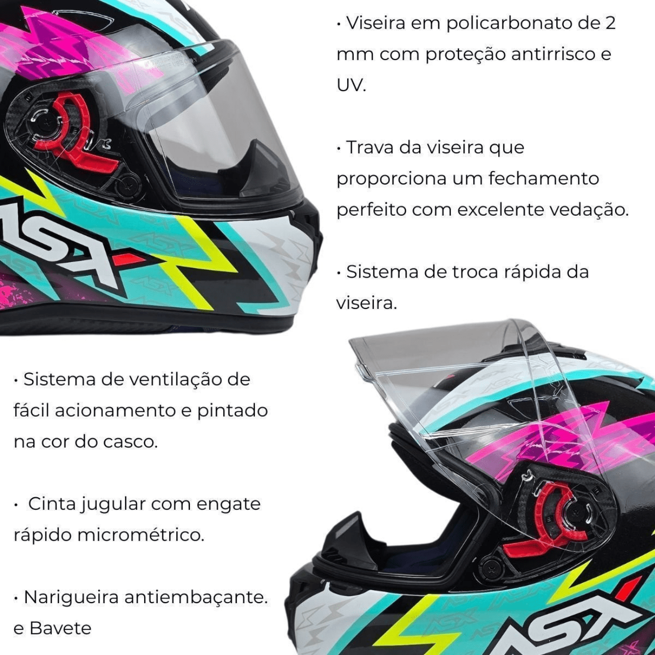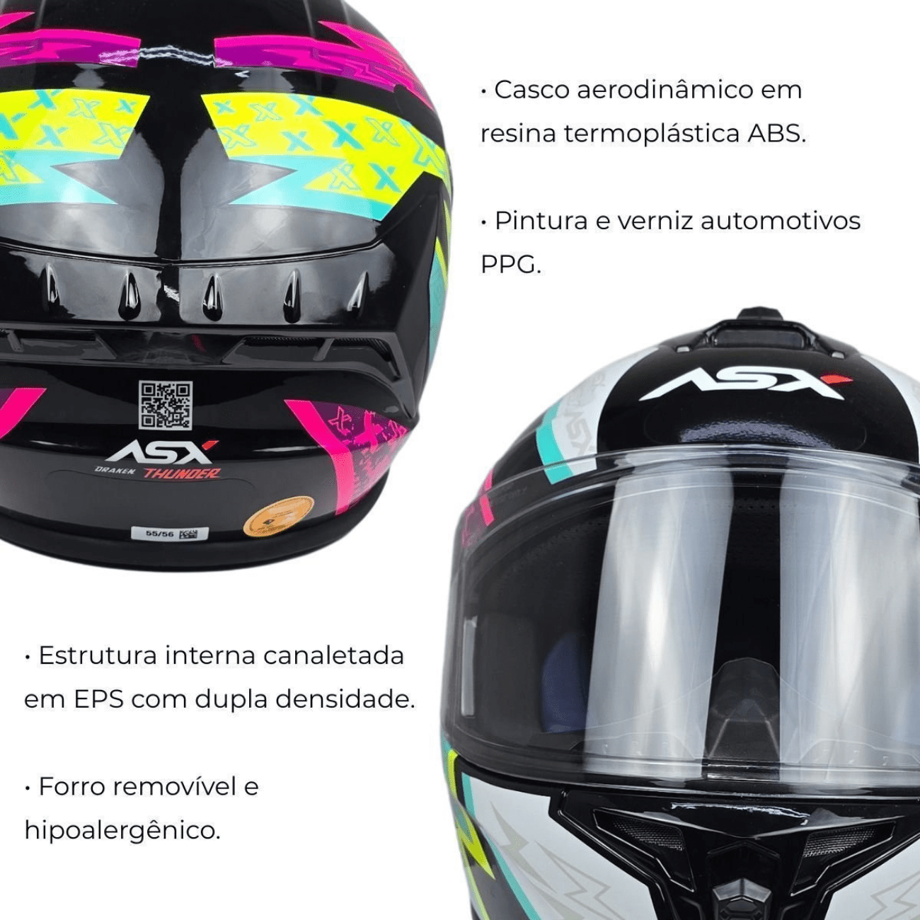 O Capacete ASX Draken Thunder foi desenvolvido para motociclistas que não abrem mão de estilo, segurança e conforto. Com casco aerodinâmico em ABS de alta resistência e acabamento fosco, oferece proteção confiável sem perder o visual esportivo. Sua viseira em policarbonato com proteção UV e antirrisco garante ampla visibilidade, enquanto o forro hipoalergênico removível proporciona praticidade e higiene. Ideal tanto para o dia a dia quanto para viagens, o Draken Thunder alia desempenho e design diferenciado.