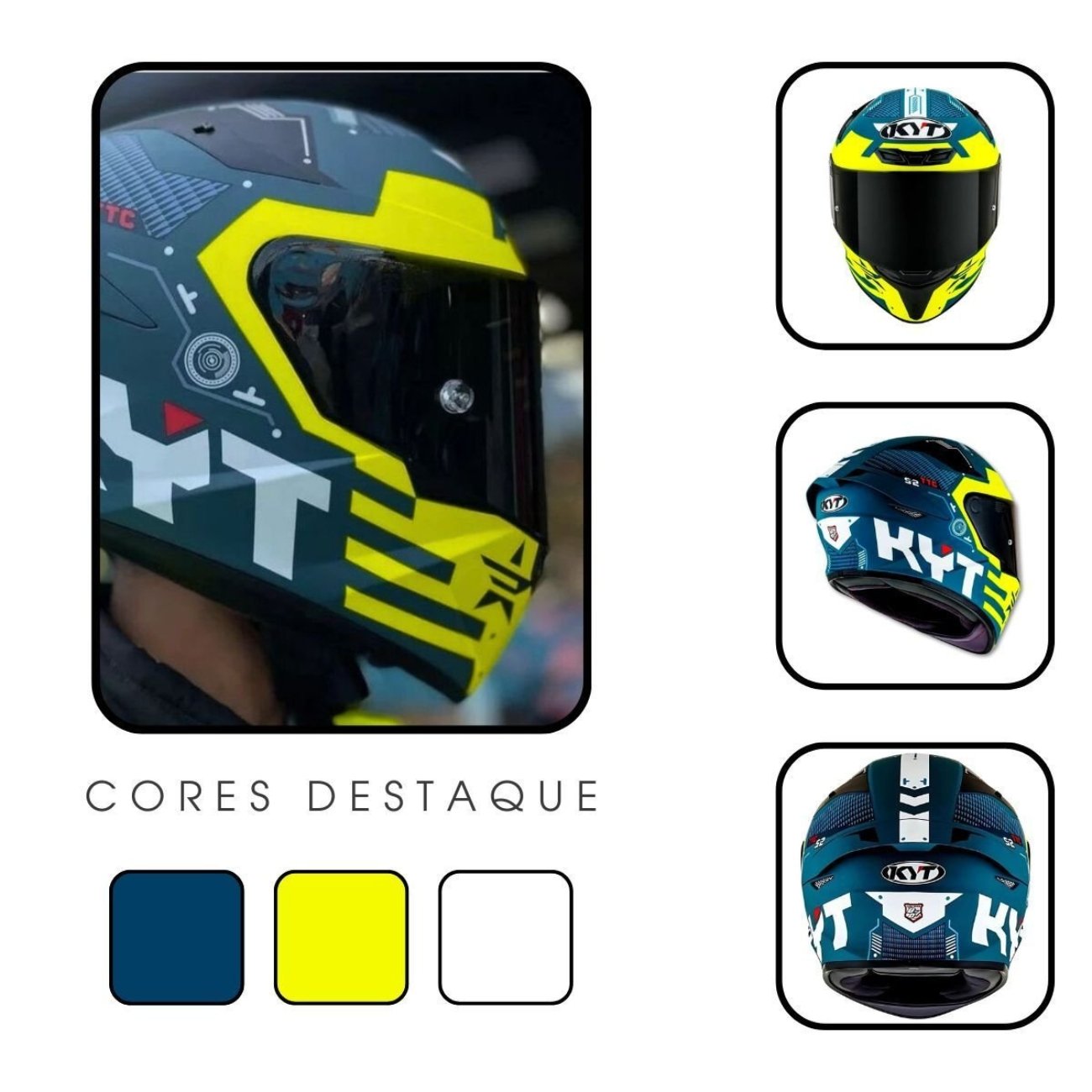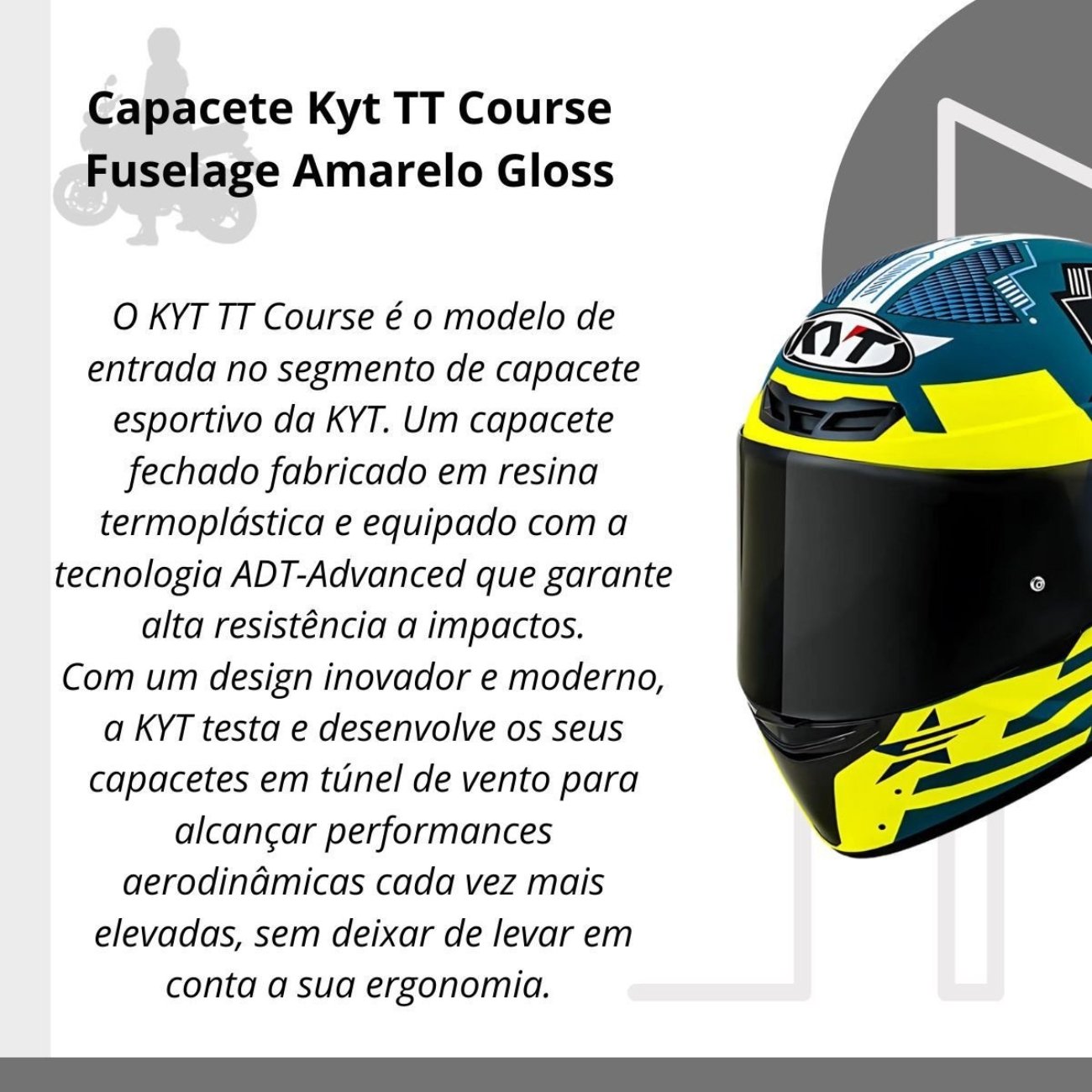O KYT TT Course é um capacete esportivo fechado, projetado para pilotos que buscam segurança, leveza e desempenho no dia a dia. Desenvolvido com resina termoplástica ADT e testado em túnel de vento, oferece alta resistência a impactos e aerodinâmica avançada. Seu casco compacto e leve, pesando em média 1450g, garante conforto mesmo em longos trajetos.