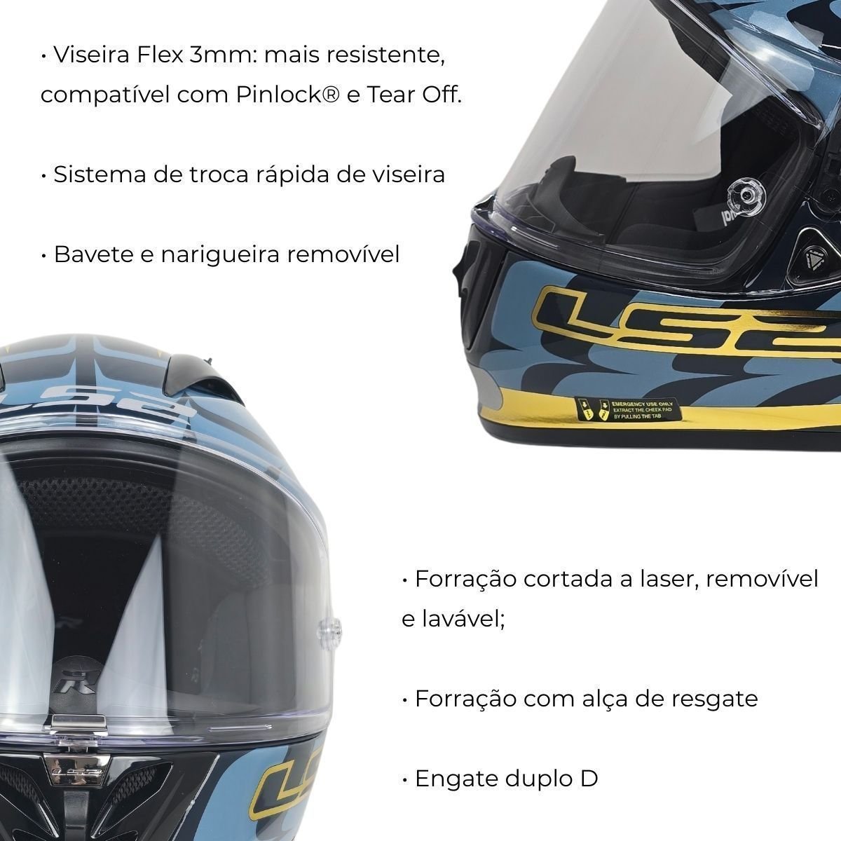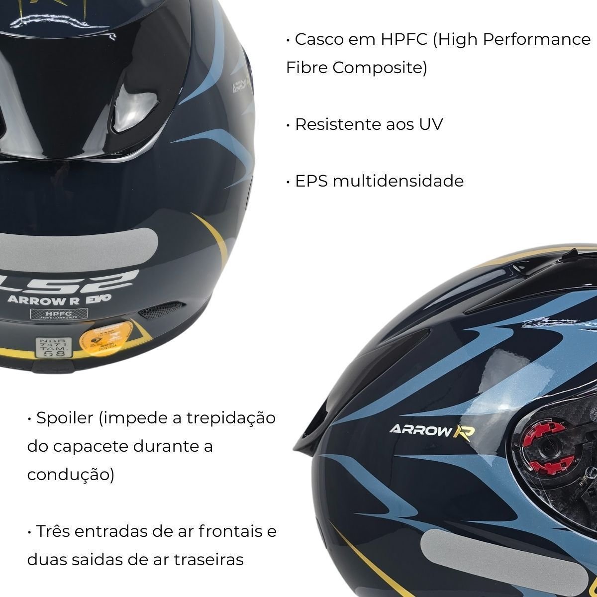 O LS2 Arrow “R” também se destaca pela segurança: alça de resgate, EPS multidensidade, jugular com fecho Duplo D e inserções refletivas aumentam a proteção em qualquer situação. Estável mesmo em alta velocidade, conta com spoiler traseiro integrado e sistema de ventilação inteligente, oferecendo equilíbrio aerodinâmico e controle térmico superior.