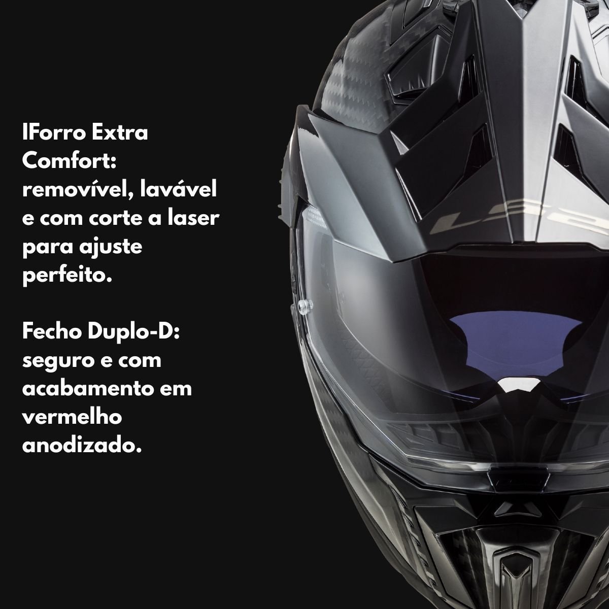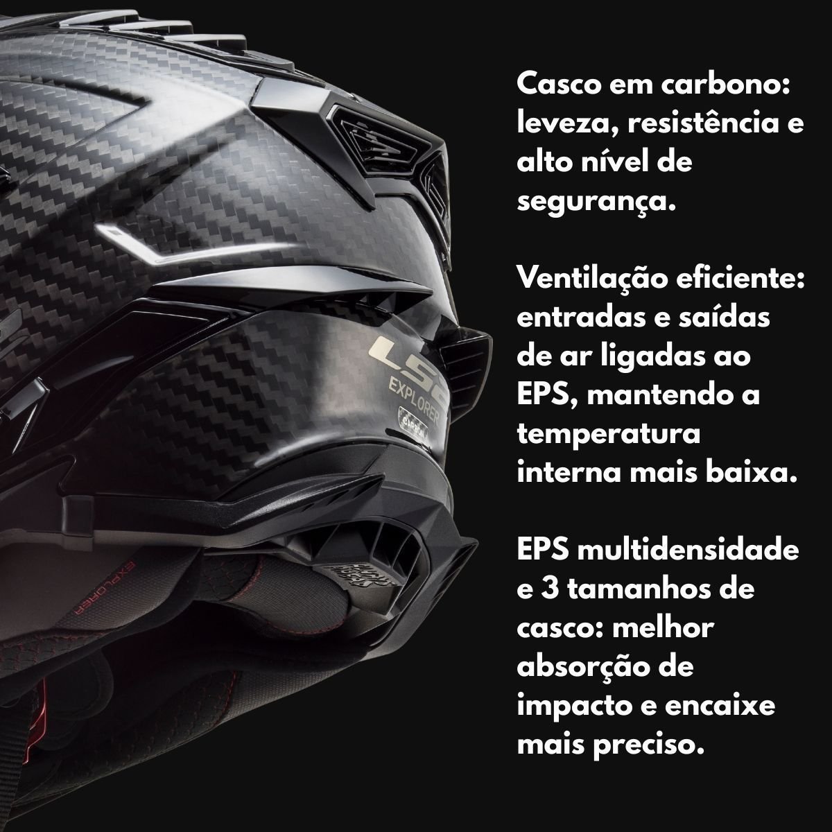 Projetado com três tamanhos de casco e EPS ajustado para máxima absorção de impactos, o Explorer oferece equilíbrio perfeito entre proteção e conforto. O interior com tecnologia LS2 3D, com peças cortadas a laser, garante encaixe preciso e confortável ao rosto. Além disso, o capacete é 3 em 1, permitindo o uso em diferentes configurações: com viseira, com goggle ou sem pala, adaptando-se a qualquer estilo de pilotagem.