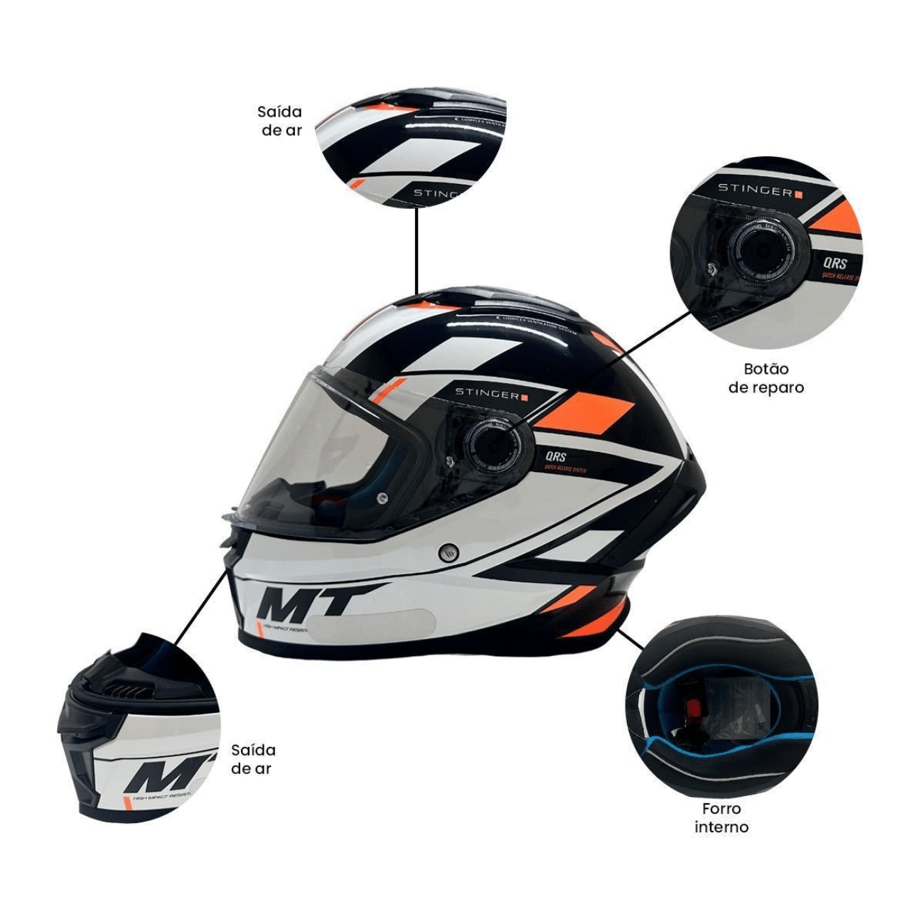 O Stinger 2 é um capacete esportivo integral que une leveza, proteção avançada e excelente custo-benefício. Desenvolvido pela MT Helmets, supera a exigente certificação europeia ECE 22.06 e oferece componentes totalmente removíveis e substituíveis, ideal para motociclistas que buscam segurança, conforto e praticidade no dia a dia.