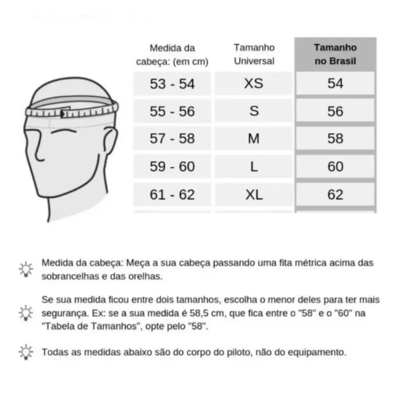 O interior conta com forração antialérgica, removível e lavável, assegurando higiene e conforto. Para maior praticidade, o fecho micrométrico permite ajuste rápido e seguro. O sistema de ventilação com entradas de ar frontais e extratores traseiros mantém o fluxo de ar constante, enquanto a viseira oferece 6 níveis de abertura, adaptando-se à necessidade do piloto.