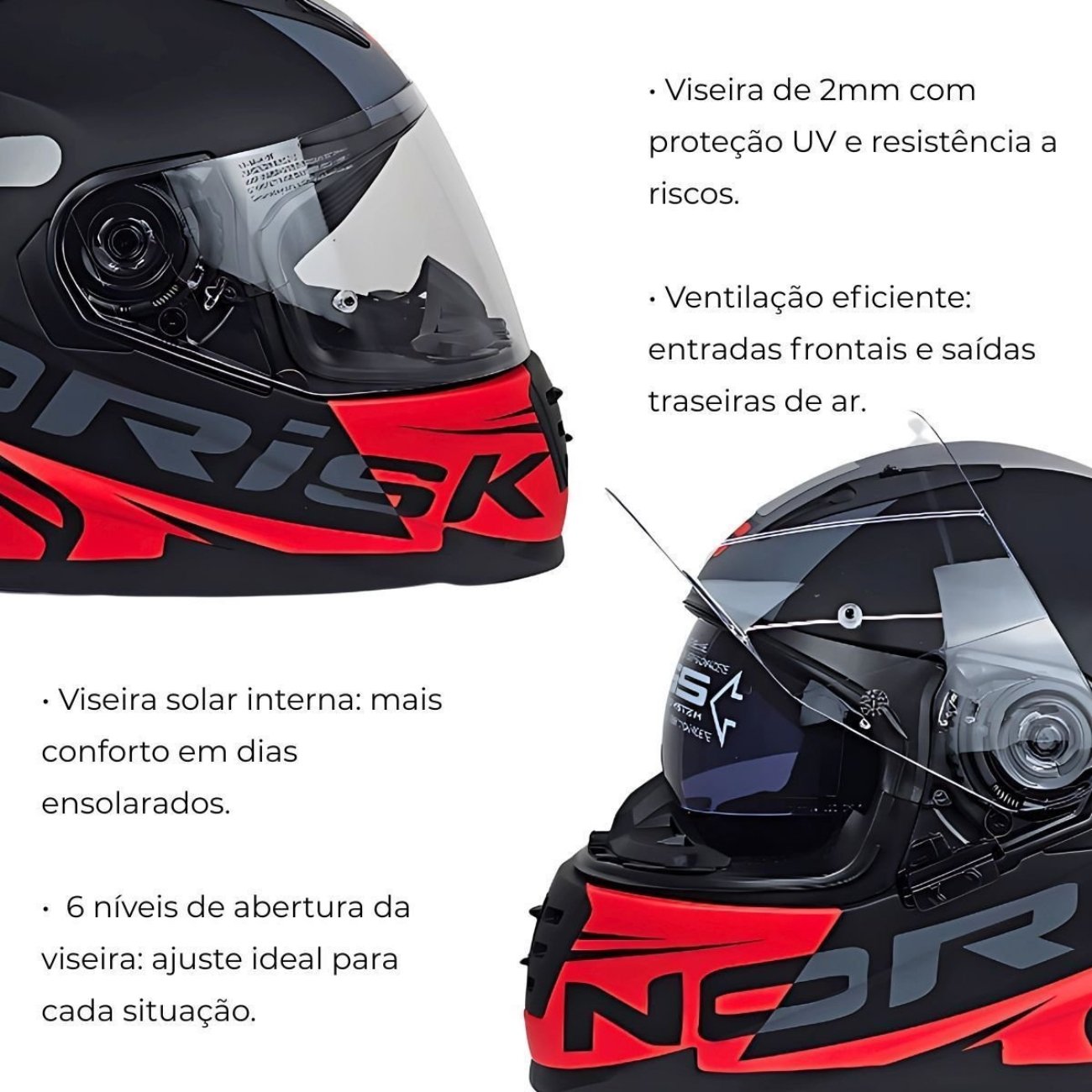 Seu casco em resina termoplástica ABS oferece resistência e leveza, enquanto a viseira de 2 mm, com proteção UV e alta resistência a riscos, protege contra os raios solares e impactos. O visor solar interno facilita a pilotagem em dias ensolarados, proporcionando conforto visual sem a necessidade de trocar a viseira.