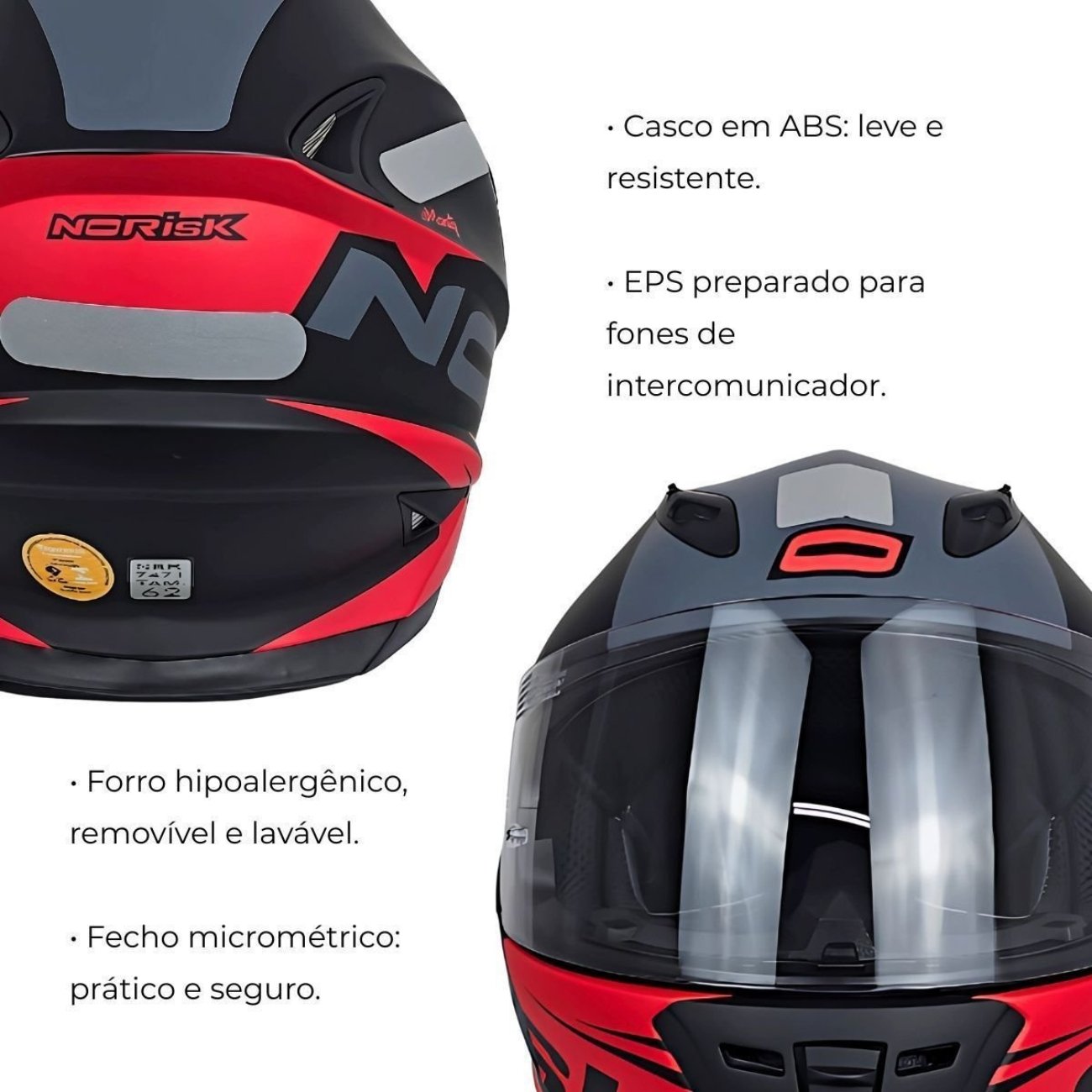 O sistema de ventilação inteligente conta com entradas de ar frontais e extratores traseiros, promovendo circulação contínua para manter a cabeça fresca durante todo o percurso. A forração interna é produzida com tecido tecnológico hipoalergênico, removível e lavável, facilitando a higiene e o uso prolongado com conforto.