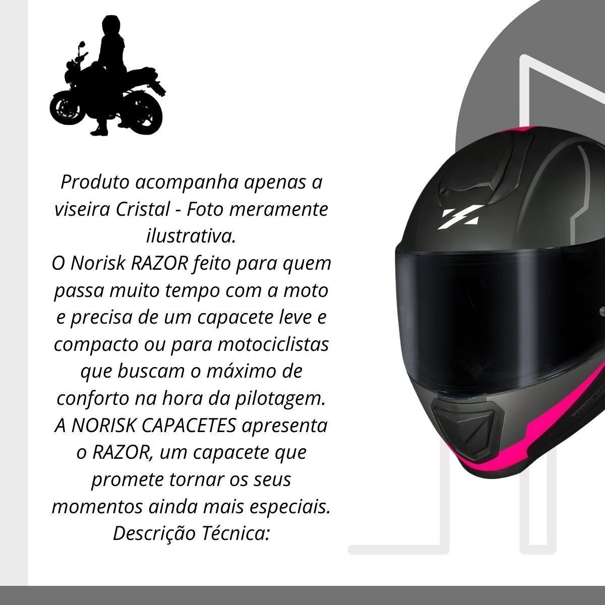 O Norisk Razor foi desenvolvido para motociclistas que passam longas horas na estrada e precisam de um capacete leve, compacto e confortável. Com design aerodinâmico e construção em ABS injetado de alta pressão, ele oferece segurança, ventilação eficiente e praticidade para o uso diário ou em viagens.