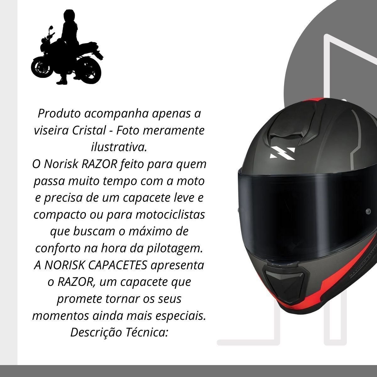 O Norisk Razor foi desenvolvido para motociclistas que passam muitas horas na estrada e buscam um capacete que una conforto, leveza e segurança. Com casco compacto e design aerodinâmico inspirado em modelos de alto desempenho, ele reduz o arrasto do ar e favorece a ventilação, tornando a pilotagem mais fluida e agradável.