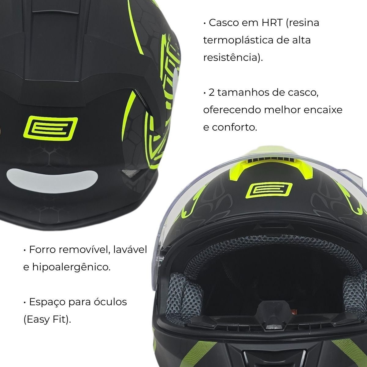 Sua estrutura em HRTS (resina termoplástica de alta resistência) proporciona segurança com leveza, enquanto o casco, disponível em dois tamanhos, garante um ajuste ergonômico para diferentes formatos de cabeça. A ventilação é um dos destaques, com entradas frontais e saídas traseiras otimizadas por túnel de vento, assegurando fluxo de ar constante e controle térmico eficiente.