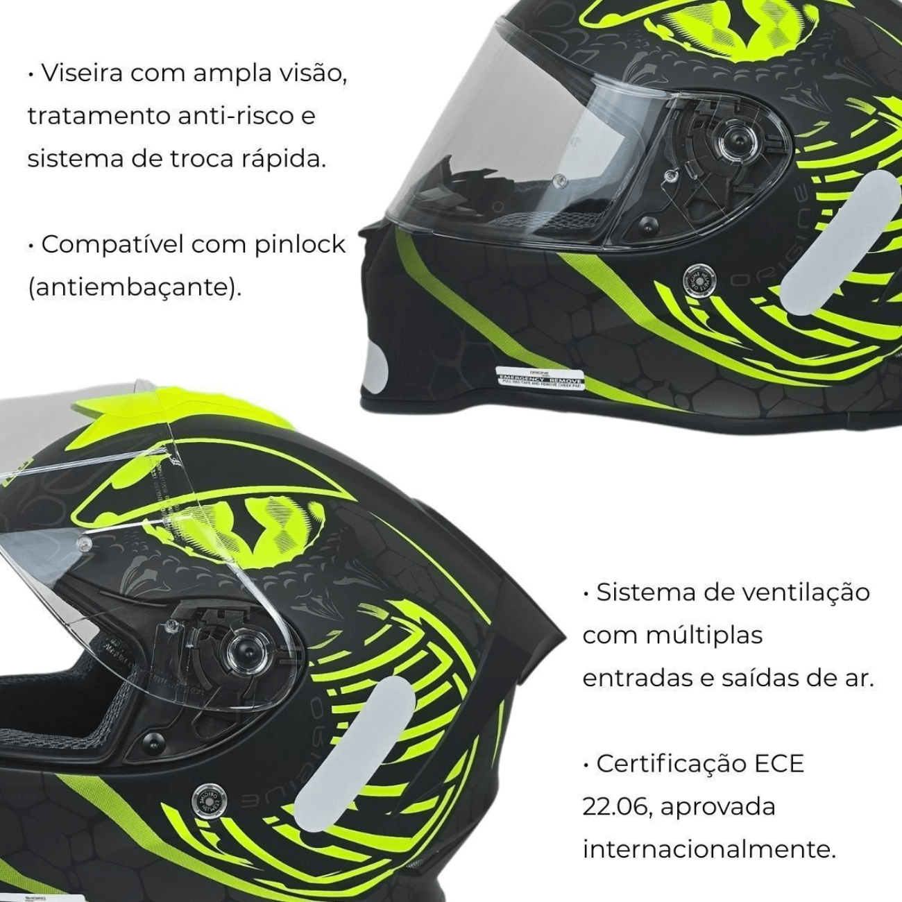 Com certificação europeia ECE 22.06 e sistema Pull Emergency, este capacete alia tecnologia, proteção e praticidade para quem exige mais na pilotagem.