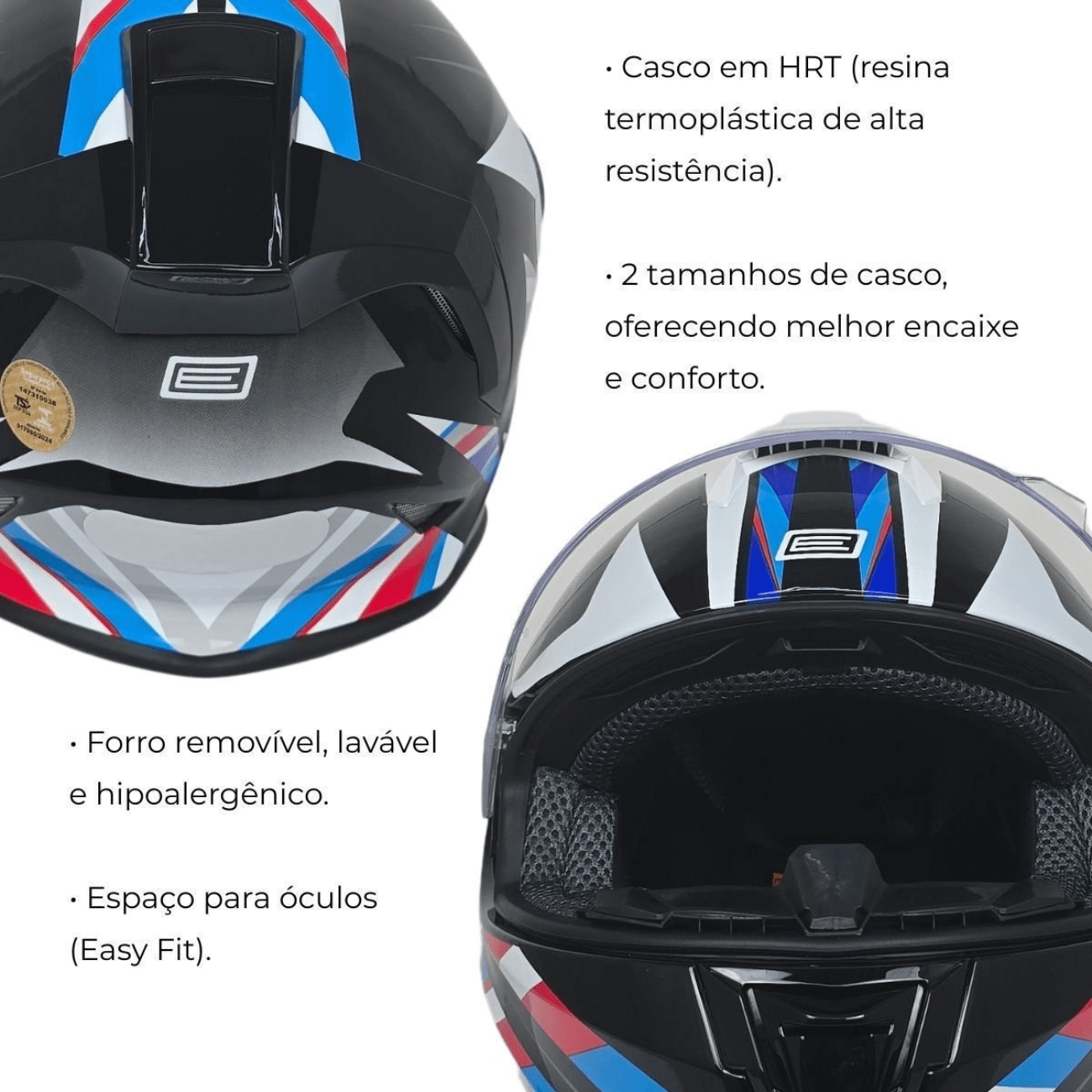 A viseira flat em policarbonato de 2 mm possui tratamento anti-risco, amplo campo de visão e encaixe para sistema Pinlock, que evita o embaçamento. O sistema de ventilação conta com entradas e saídas estrategicamente posicionadas, garantindo circulação contínua de ar para maior conforto térmico.