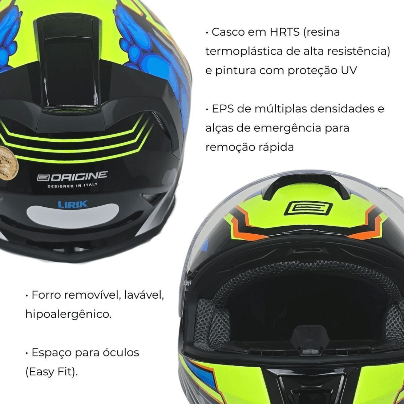 O Capacete Fechado Urbano Origine Dinamo SZ Lirik é projetado para atender às necessidades de todos os motociclistas que buscam segurança, conforto e alta performance, seja no trânsito urbano ou em viagens longas. Com design moderno, leve e aerodinâmico, o Dinamo SZ Lirik oferece uma pilotagem estável e silenciosa, graças ao seu desenvolvimento em túnel de vento, que reduz ruídos e melhora a resistência ao vento.