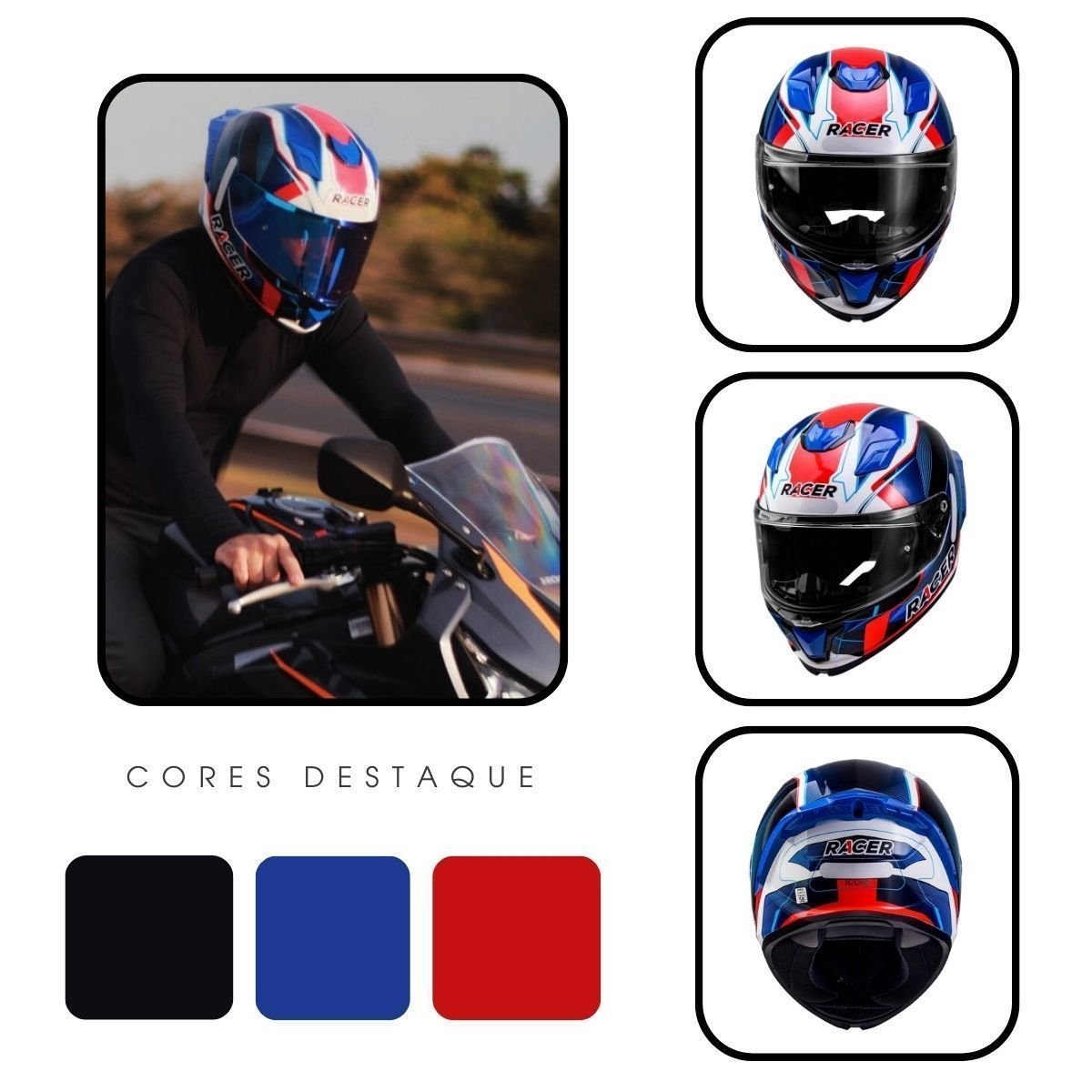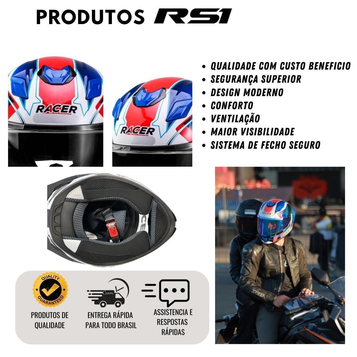 Projetado com foco esportivo e estilo moderno, o capacete Racer 1 RC1 Octane oferece linhas fluidas e visual Racing, desenvolvido especialmente para o mercado brasileiro. Seu grande diferencial é o spoiler na cor do capacete, fixado por três parafusos que permitem fácil substituição, garantindo funcionalidade mesmo após impactos ou quedas, algo exclusivo desta marca.