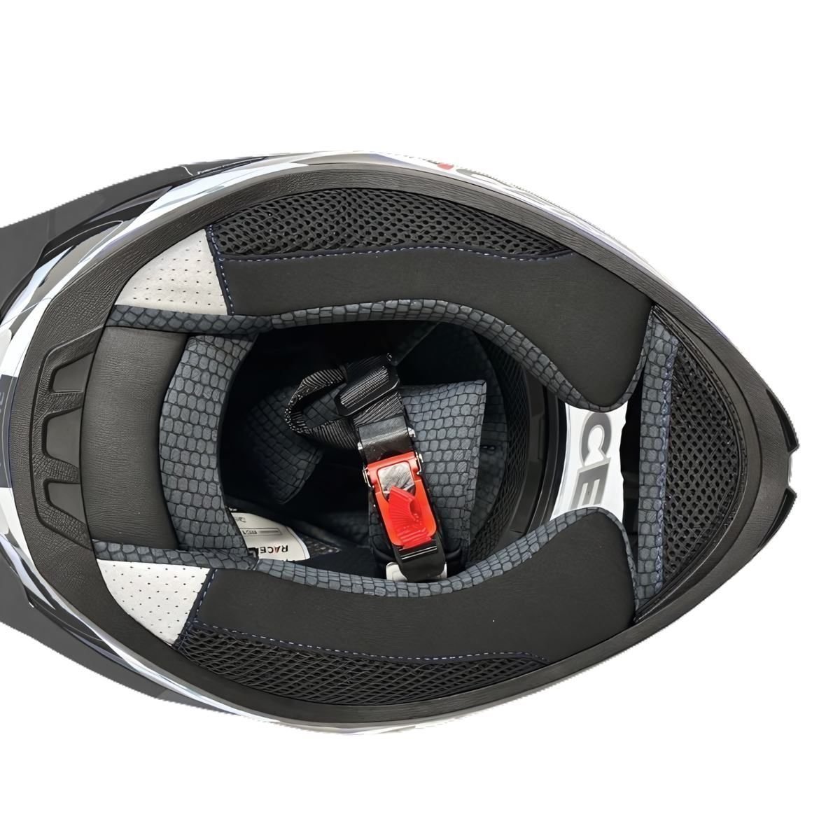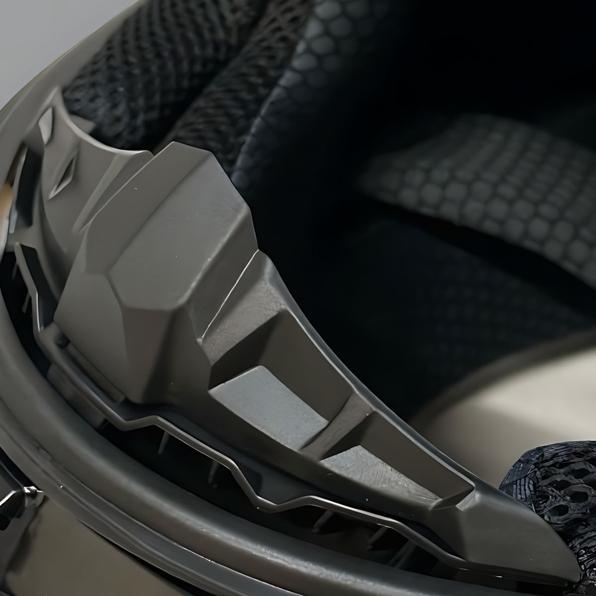 O grande diferencial está no spoiler removível na cor do casco, fixado por três parafusos, que pode ser substituído de forma simples em caso de quedas leves ou pequenos impactos. Esse recurso exclusivo mantém a funcionalidade aerodinâmica e o visual intactos, evitando gastos desnecessários com a troca do capacete inteiro — uma inovação que nenhum outro modelo no mercado oferece.