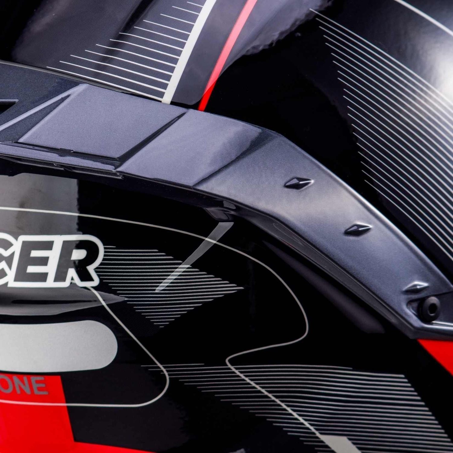 Seu principal diferencial está no spoiler removível e substituível na cor do casco, fixado por três parafusos. Um sistema exclusivo no mercado que permite trocar apenas o spoiler em caso de impacto ou dano leve, prolongando a vida útil do capacete e mantendo sua estética e desempenho intactos.