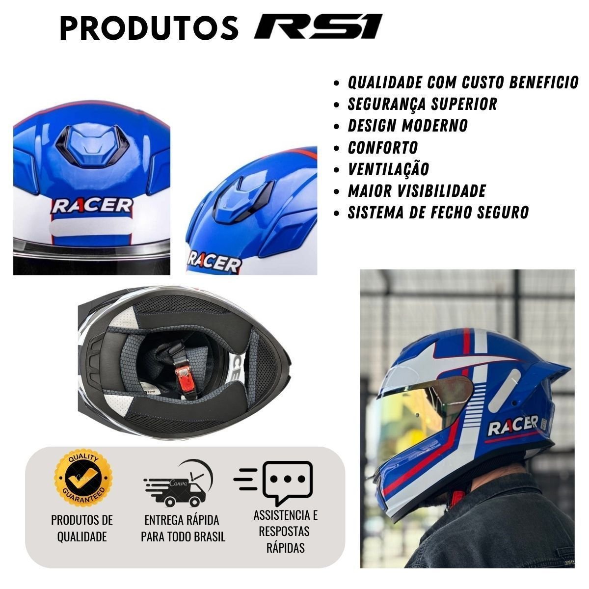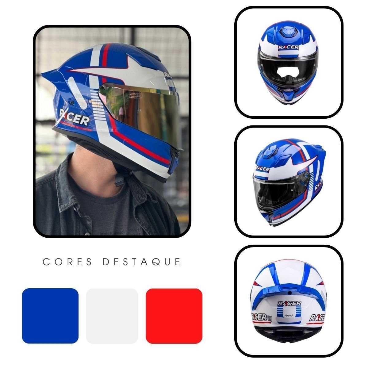 Capacete Racer1 Rc1 Nava Azul Branco Vermelho Mais Viseira Rc1 Fume