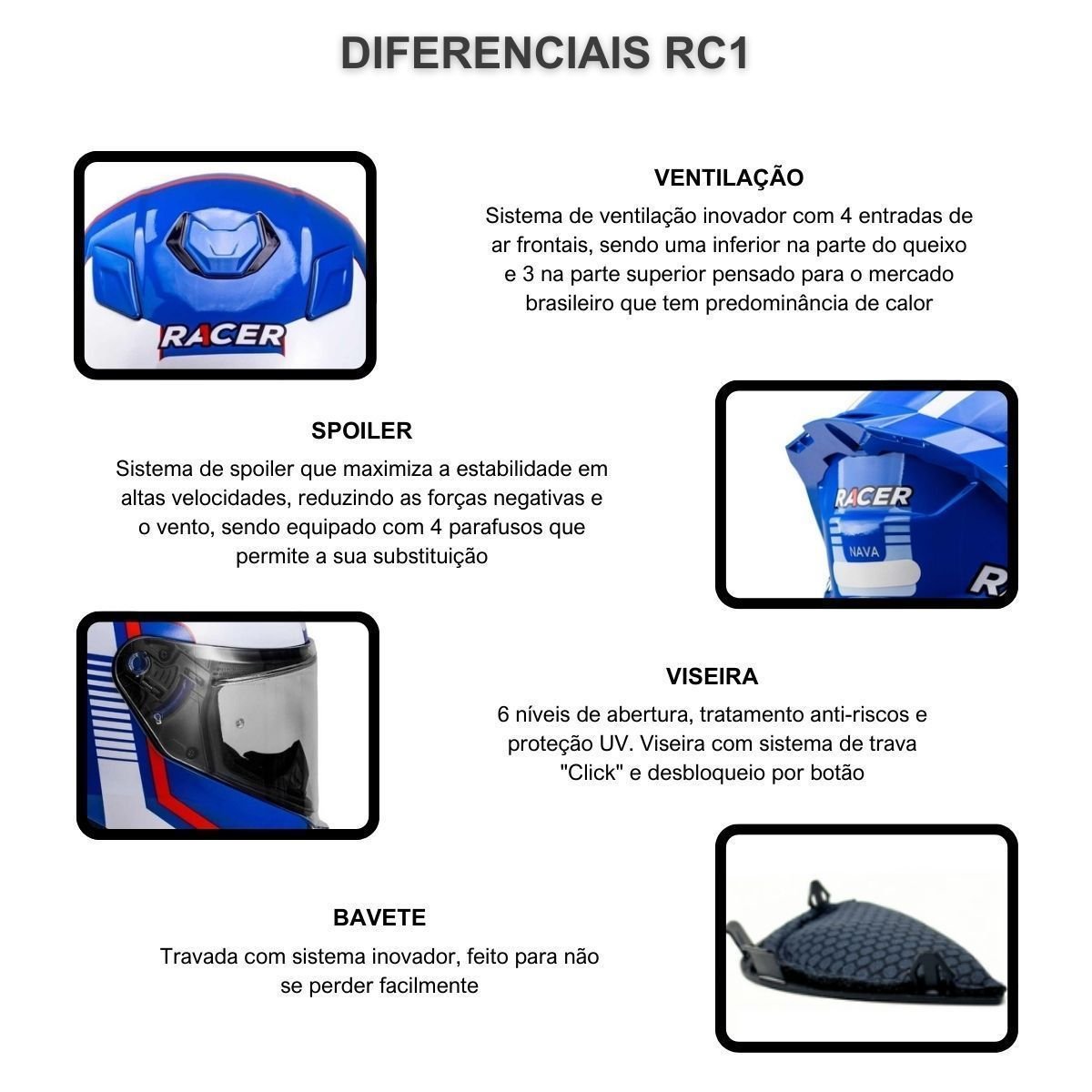 Único capacete do mercado com spoiler na cor do capacete com design esportivo integrado por 3 parafusos que permite substituição; diferencial que nenhuma outra marca tem, pois em caso de impacto, queda ou mesmo uma batida pequena em outro objeto praticamente perde a funcionalidade do spoiler, e sendo removível basta substituir e ter seu capacete em ordem novamente.