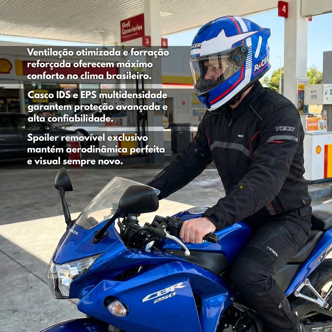 Desenvolvido para motociclistas que não abrem mão de desempenho, segurança e estilo, o Capacete Esportivo com Spoiler Removível combina aerodinâmica avançada, ventilação eficiente e materiais de alta resistência. Com design inspirado nas pistas e acabamento robusto, é ideal para o dia a dia nas ruas e estradas brasileiras.