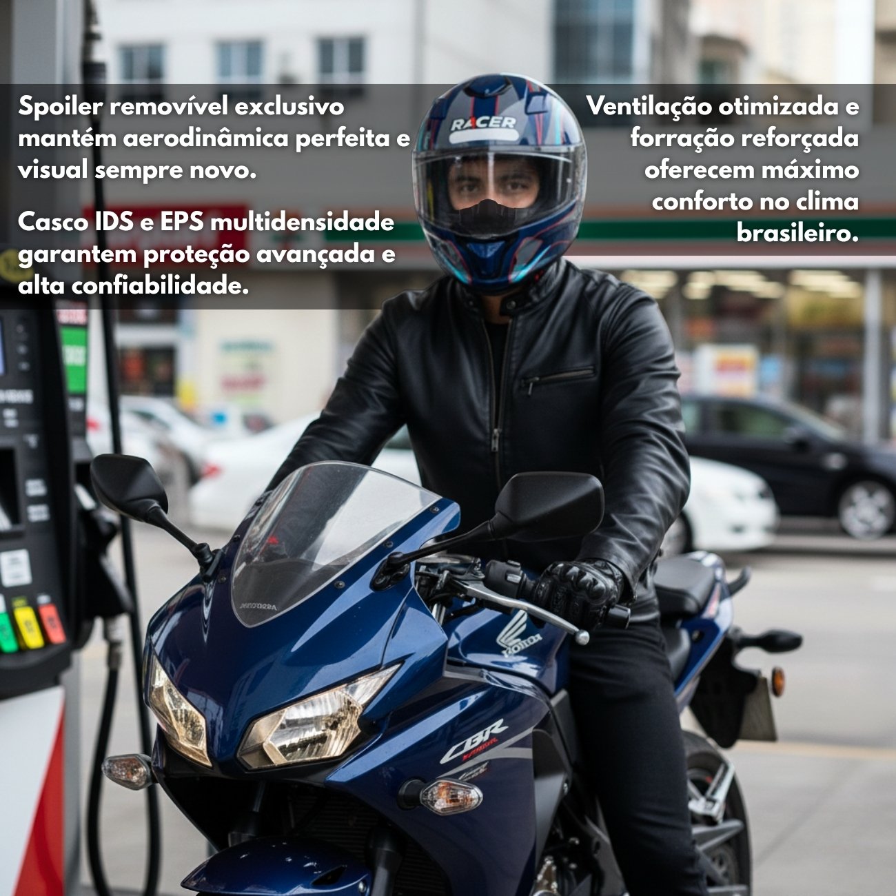 Desenvolvido com design esportivo e linhas modernas, este capacete oferece visual Racing aliado a ajustes específicos para o mercado brasileiro. Seu principal diferencial é o spoiler na cor do capacete, fixado por três parafusos, que pode ser facilmente substituído em caso de impacto ou pequenas batidas, garantindo manutenção simples e prolongando a vida útil do produto.