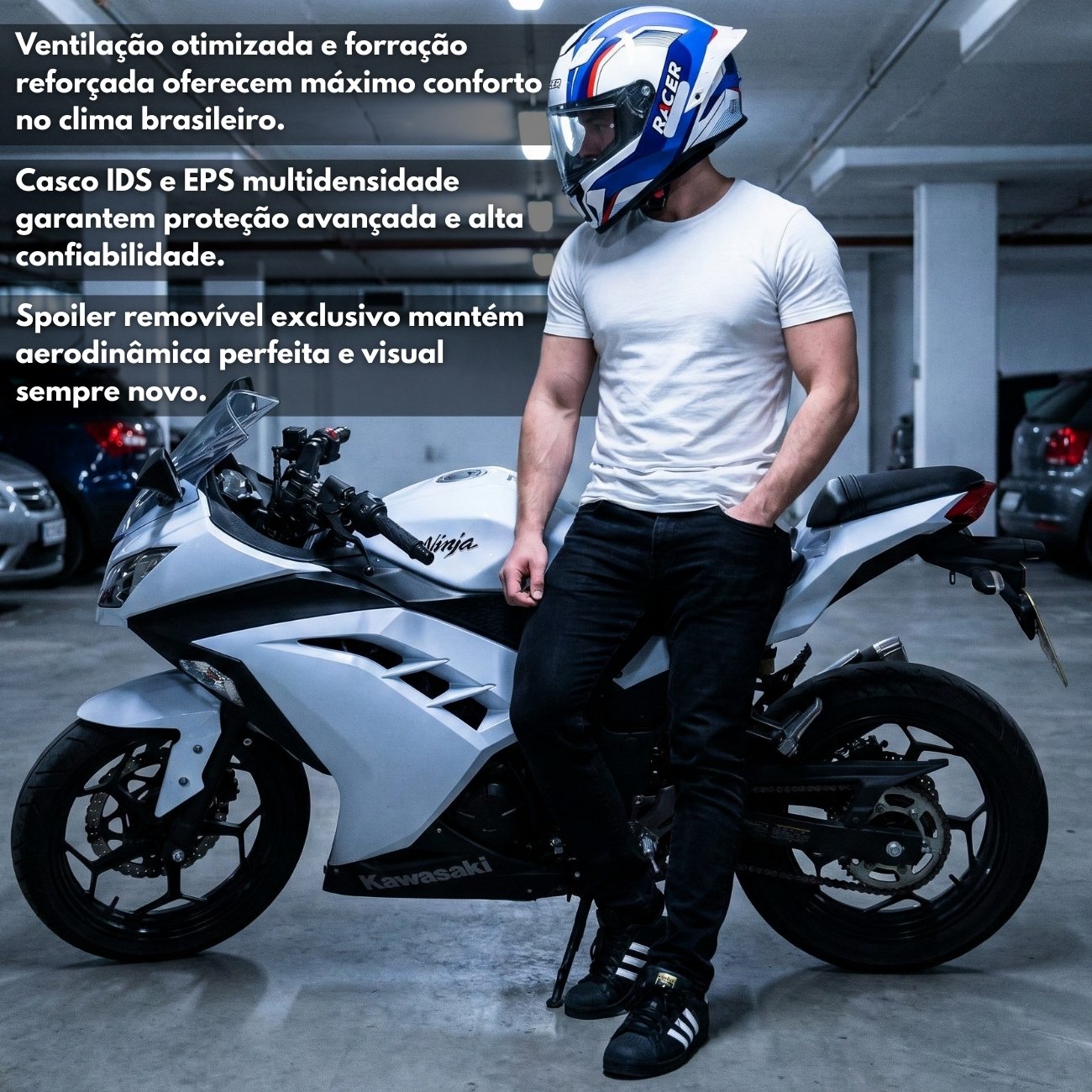 Desenvolvido especialmente para o mercado brasileiro, este capacete combina design moderno e visual Racing com alta funcionalidade e conforto. Seu grande diferencial é o spoiler na cor do capacete, fixado por três parafusos, que pode ser facilmente substituído em caso de impacto ou batida, mantendo a integridade e o visual do capacete sem necessidade de troca completa.