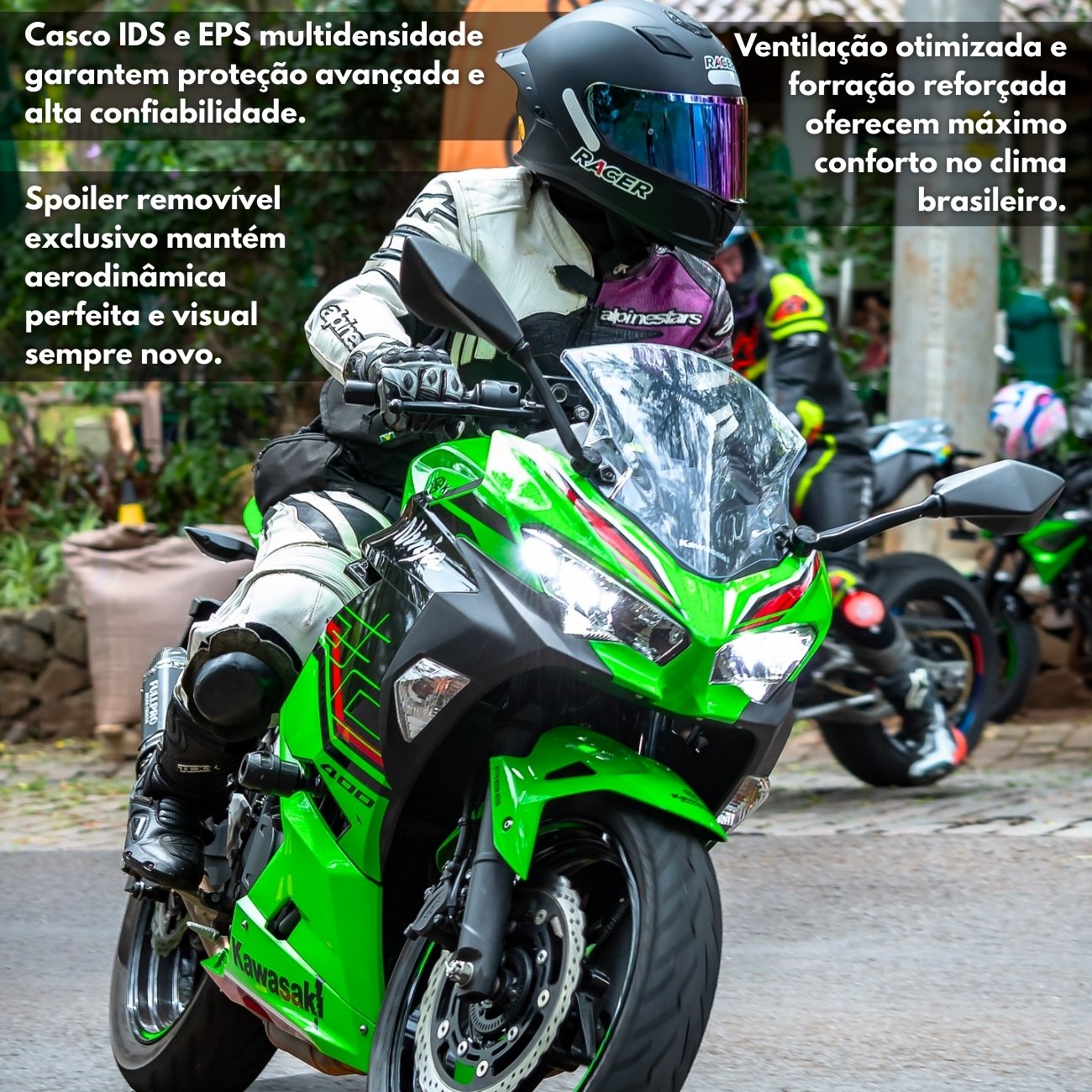 O grande diferencial é o spoiler removível na cor do casco, com fixação por três parafusos. Esse sistema exclusivo permite a substituição rápida da peça em caso de impactos leves, mantendo a performance aerodinâmica e o visual do capacete sem a necessidade de troca completa — um recurso que nenhum outro modelo no mercado oferece.