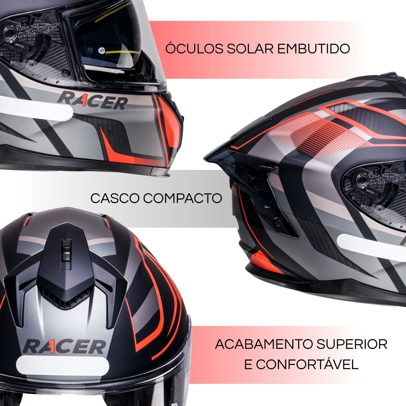 O Capacete Racer1 RC2 Start foi desenvolvido para atender às necessidades do motociclista que busca segurança, qualidade e preço justo. Com design compacto e leve, oferece excelente acabamento e ampla visibilidade graças à viseira de alta qualidade, garantindo conforto e proteção em qualquer situação, seja no trânsito urbano ou em rodovias.