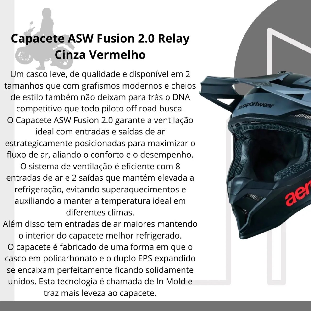 O ASW Fusion 2.0 Relay é o capacete ideal para quem vive o off-road com intensidade. Leve, resistente e com visual moderno, ele une o estilo agressivo dos grafismos com a segurança e a performance exigidas por pilotos de motocross, trilha e outras modalidades fora de estrada.