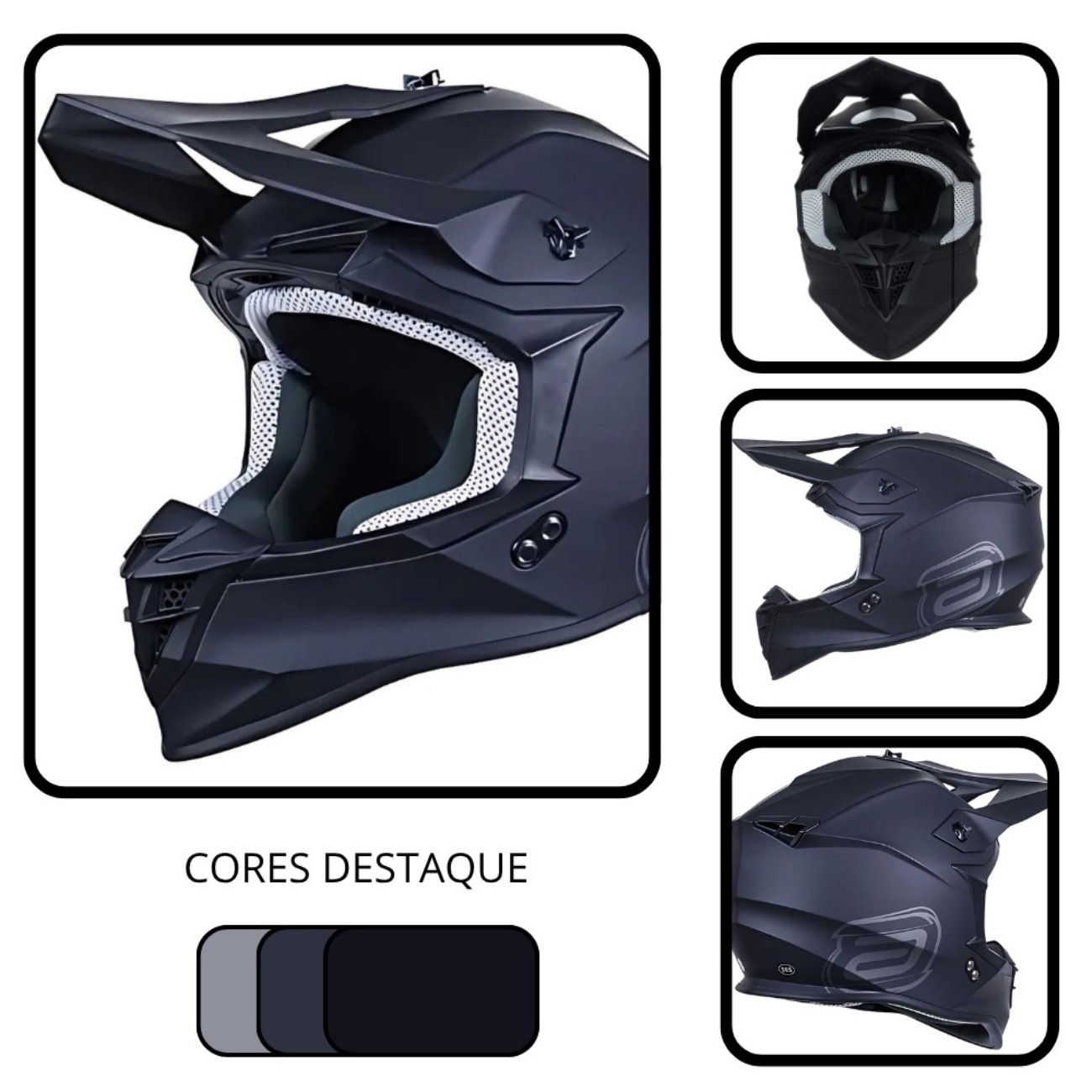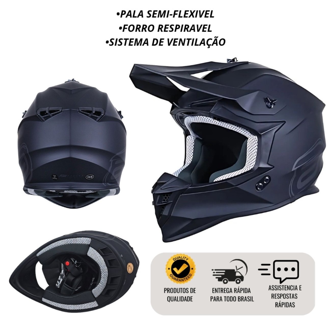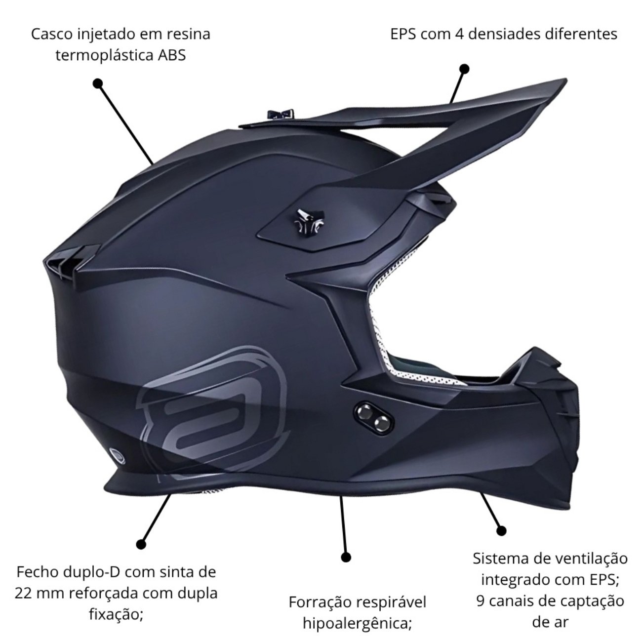 Casco em ABS Termoplástico Injetado: Estrutura leve e extremamente resistente, perfeita para os desafios do off-road.