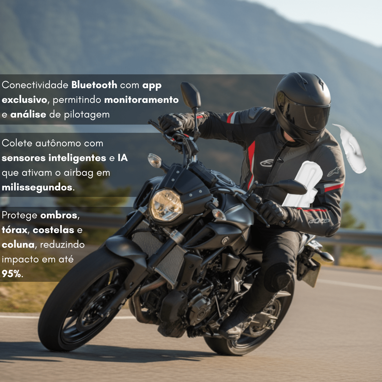 Com tecnologia de ponta e sensores de última geração, o Tech-Air 5 detecta colisões iminentes e aciona o airbag em apenas 20 a 40 milissegundos, protegendo ombros, tórax, costelas e coluna mesmo em impactos com a moto parada. Além disso, é compatível com o aplicativo Tech-Air®, que fornece análises de pilotagem e monitoramento em tempo real do equipamento.