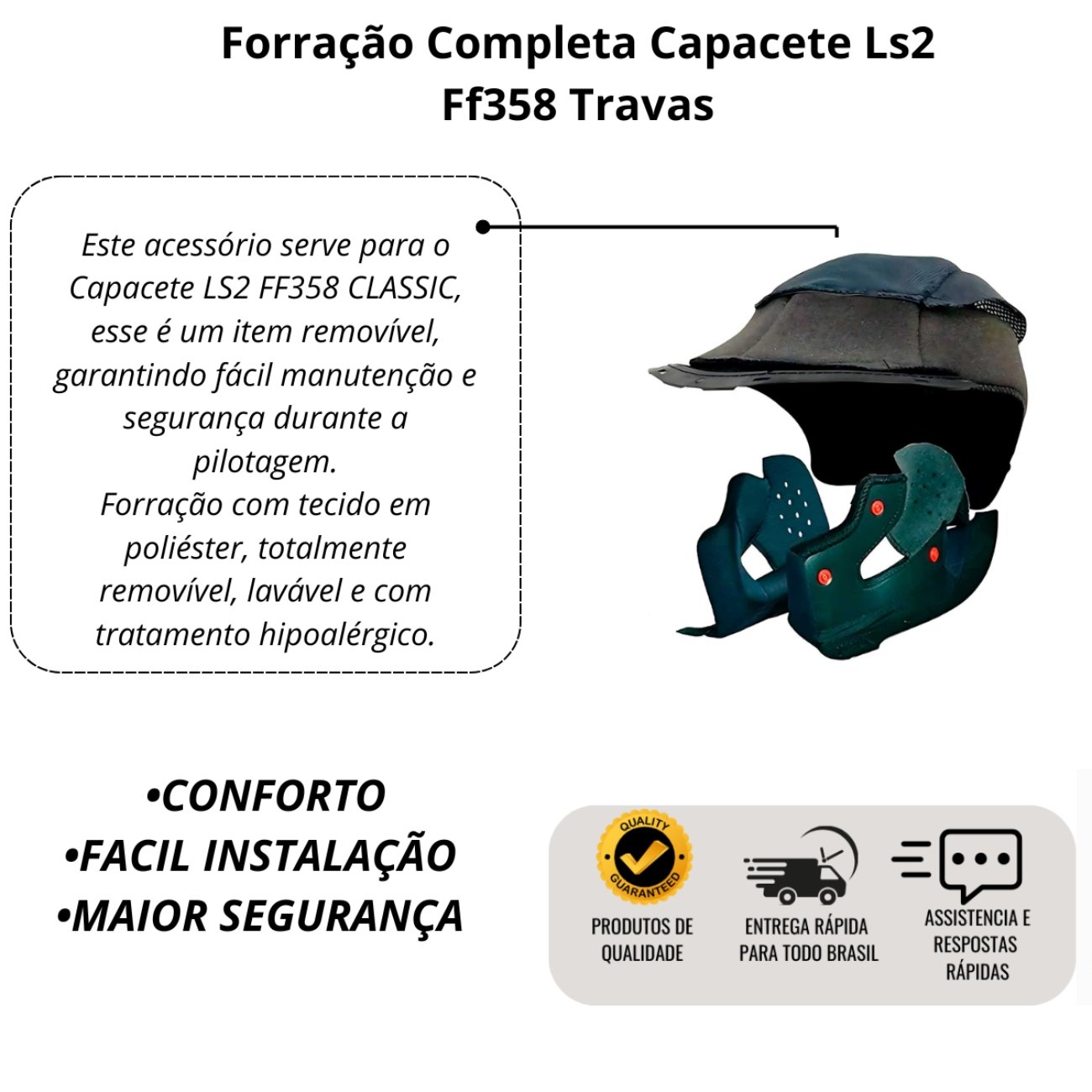 Renove o interior do seu capacete com a Forração Original LS2, desenvolvida exclusivamente para o modelo FF358 com sistema de travas. Essa peça é essencial para manter o conforto, a higiene e o ajuste correto do capacete, principalmente para quem utiliza com frequência.